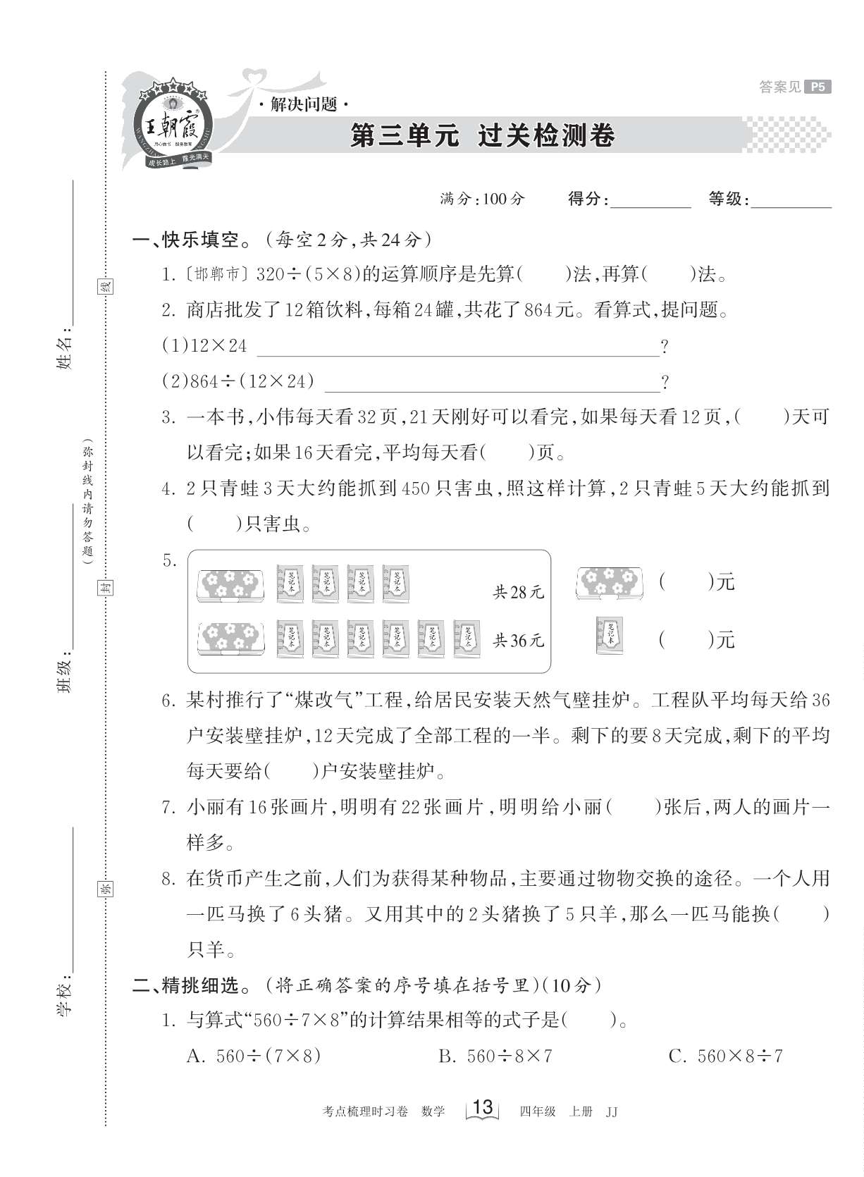 2023上册四年级数学冀教版 第三单元 过关检测卷