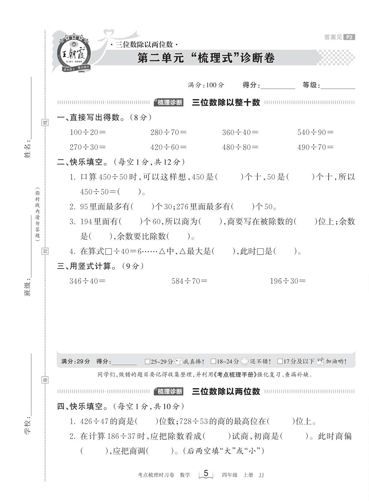 2023上册四年级数学冀教版 第二单元 “梳理式”诊断卷