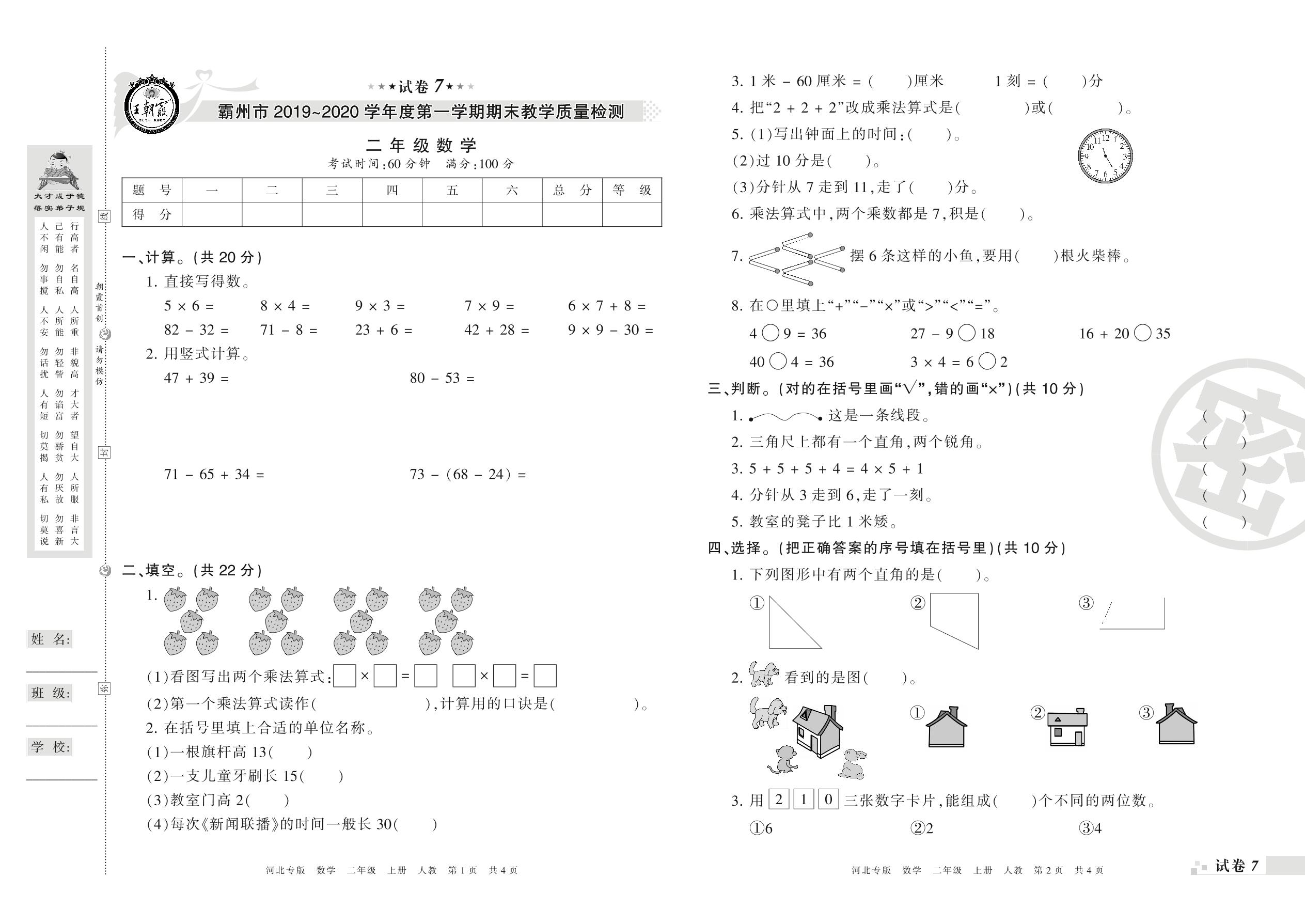 2019-2020学年第一学期霸州市二年级数学试卷(人教版)【7】