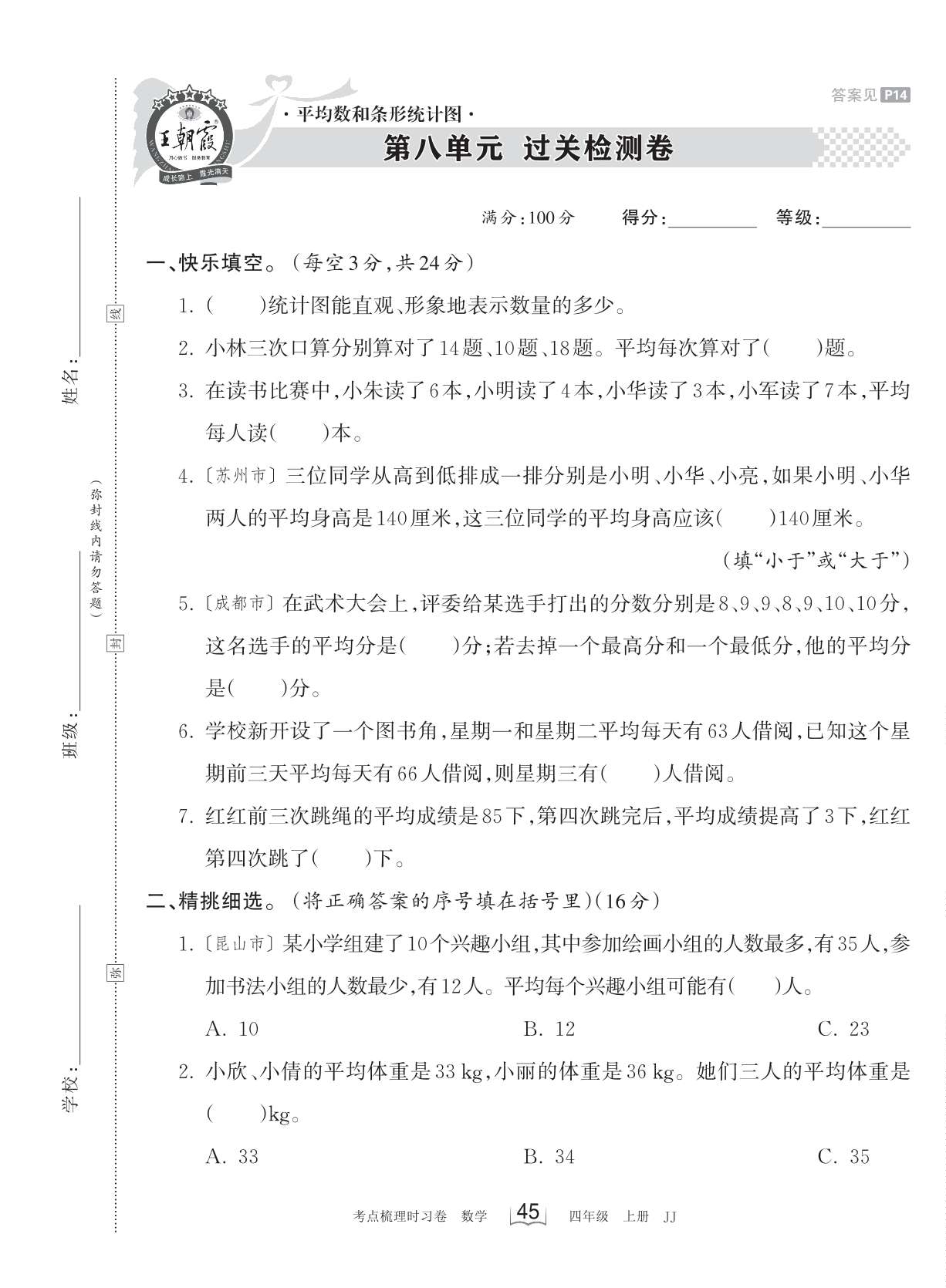 2023上册四年级数学冀教版 第八单元 过关检测卷