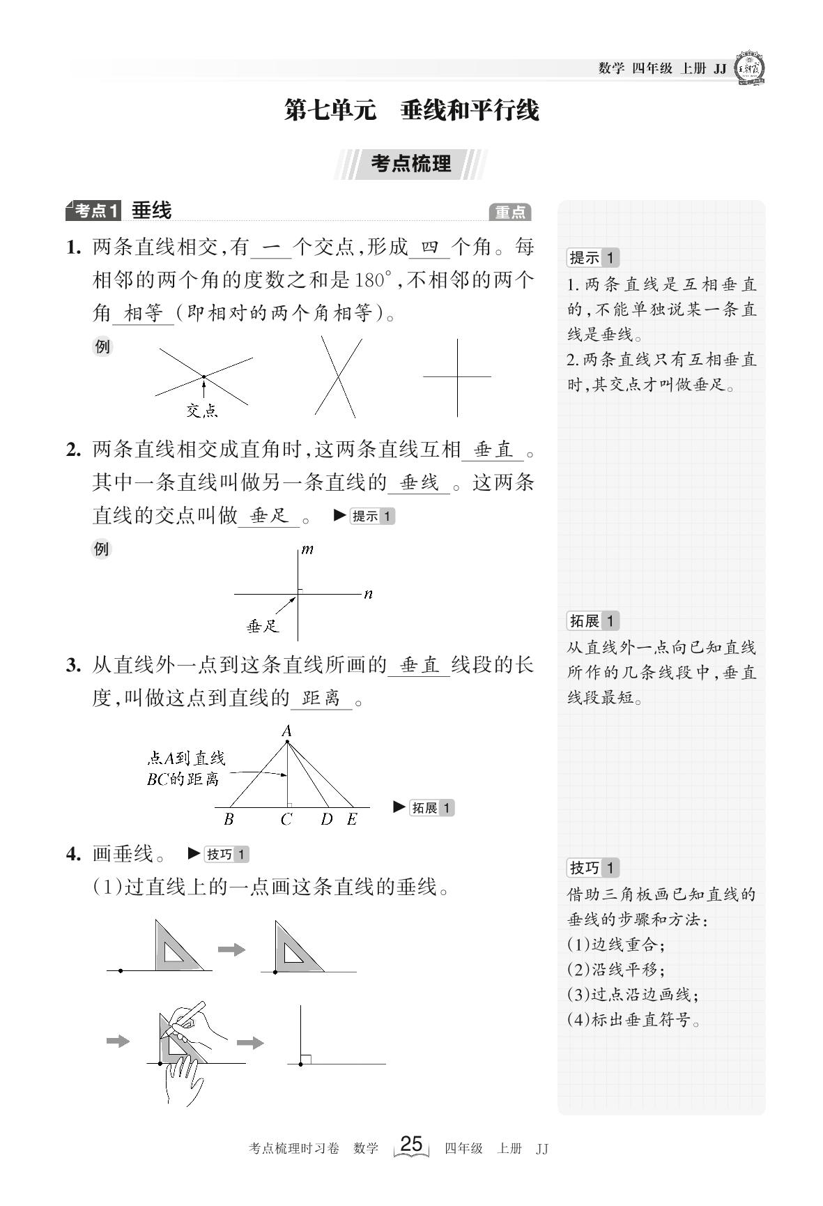 2023上册四年级数学冀教版 考点梳理手册——第七单元 垂线和平行线