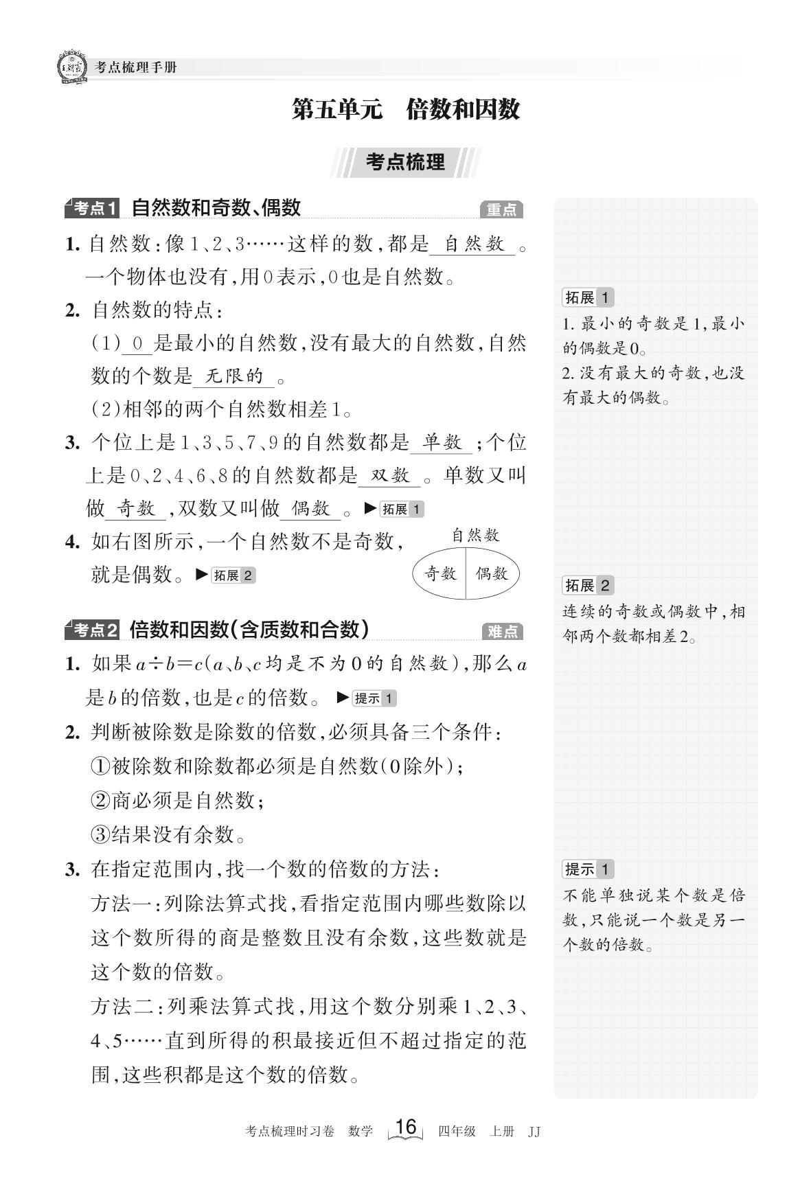 2023上册四年级数学冀教版 考点梳理手册——第五单元 倍数和因数
