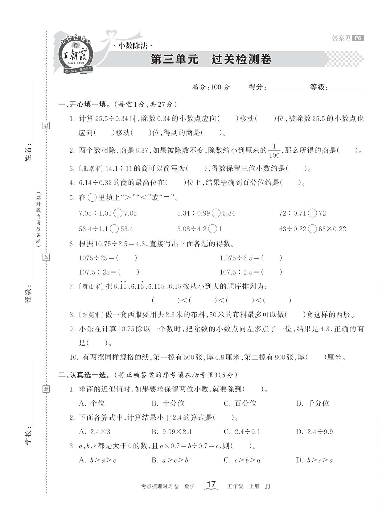 2023上册五年级数学冀教版 第三单元 过关检测卷
