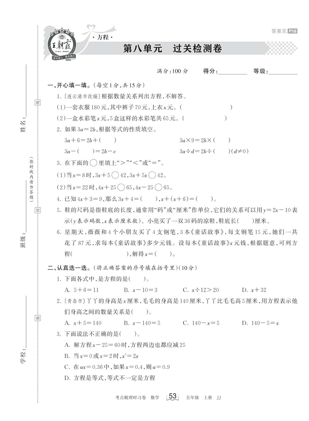 2023上册五年级数学冀教版 第八单元 过关检测卷