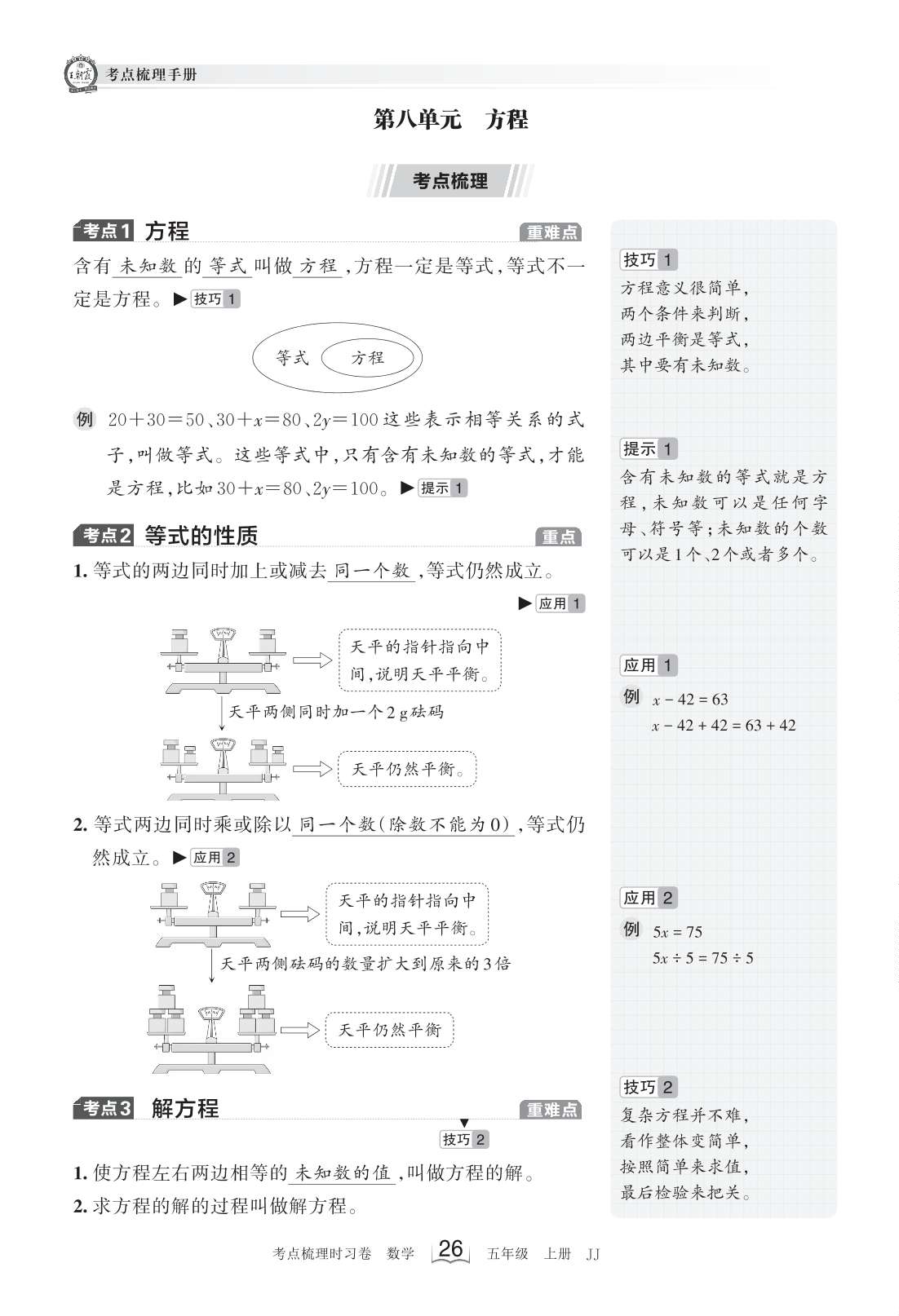2023上册五年级数学冀教版 考点梳理手册——第八单元 方程