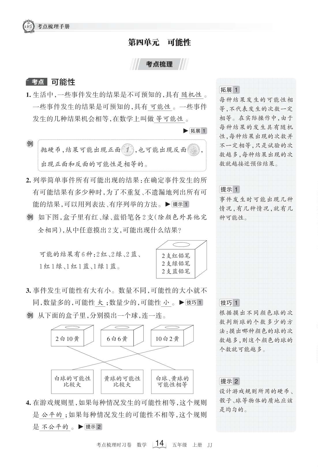 2023上册五年级数学冀教版 考点梳理手册——第四单元 可能性