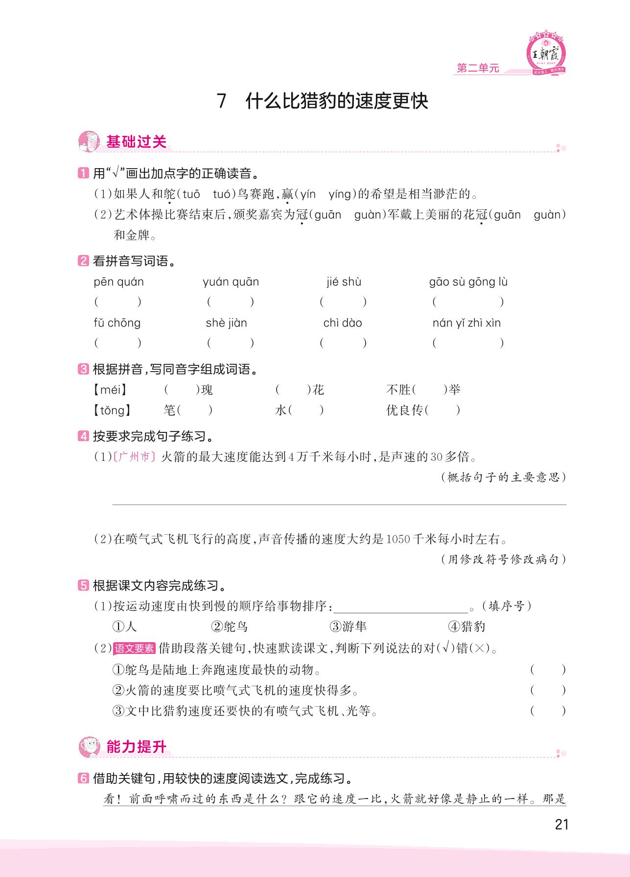 2023上册五年级语文人教版 第二单元 阅读策略——7 什么比猎豹的速度更快