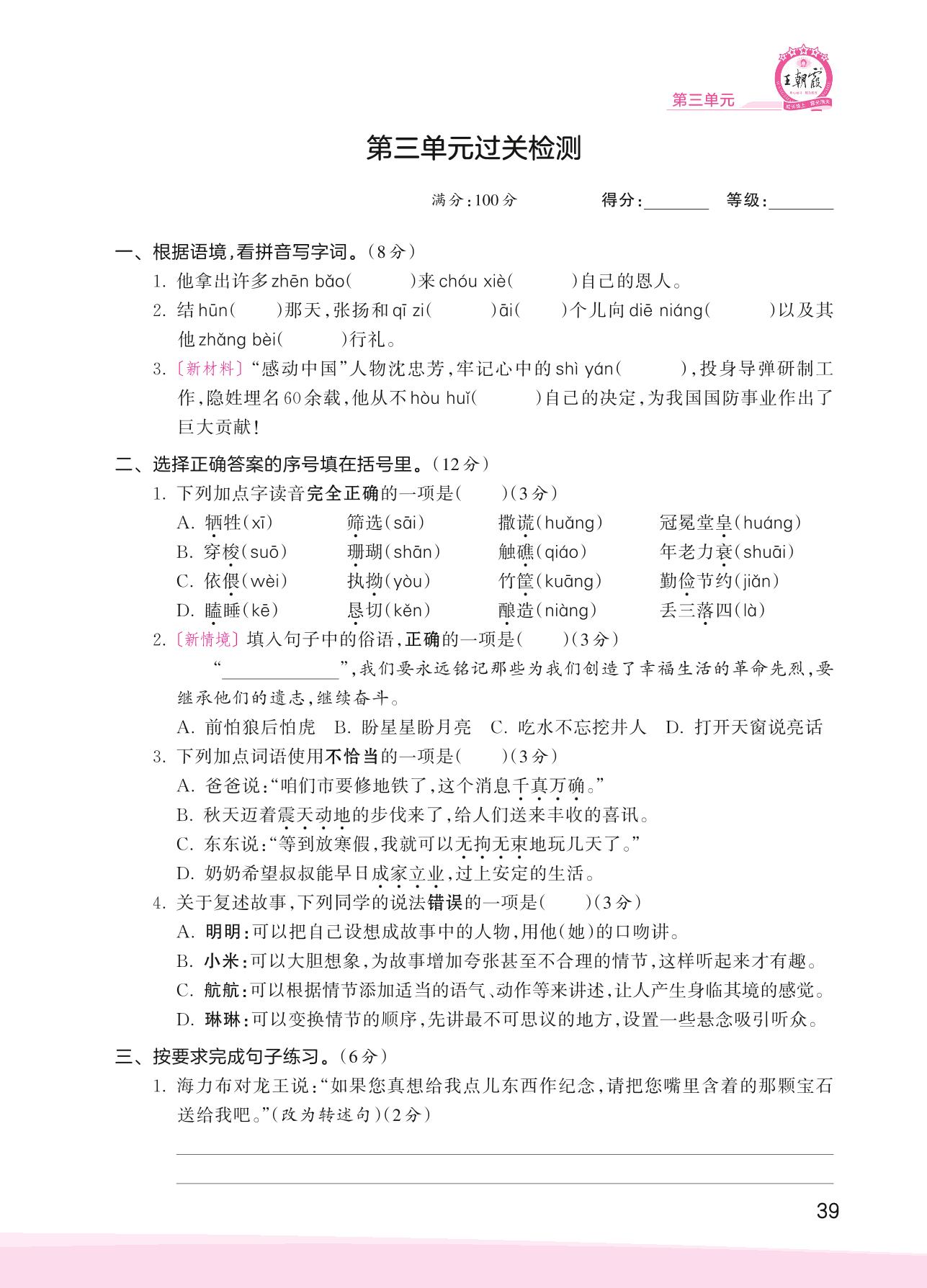 2023上册五年级语文人教版 第三单元过关检测