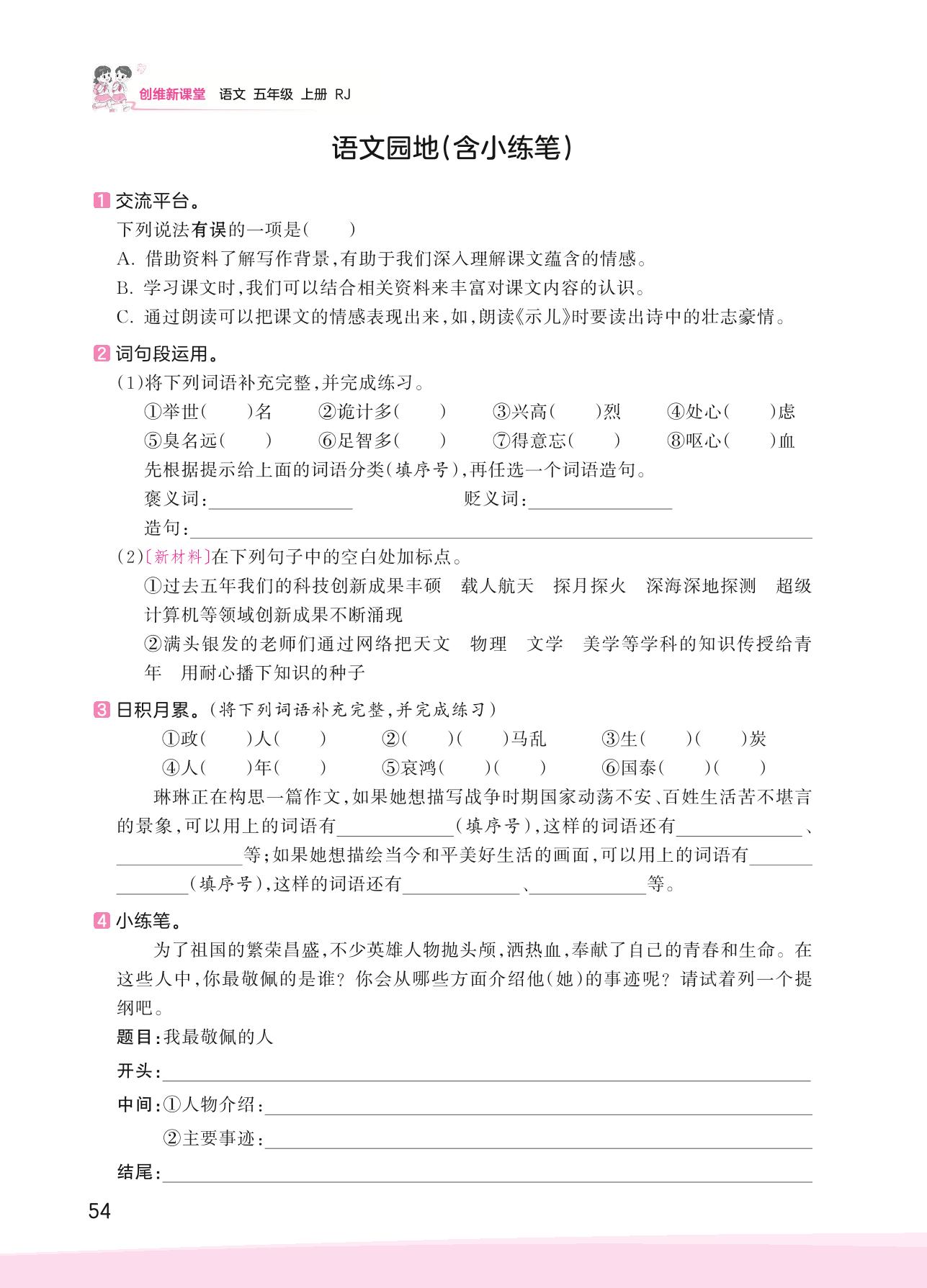 2023上册五年级语文人教版 第四单元 爱国情怀——语文园地[含小练笔]