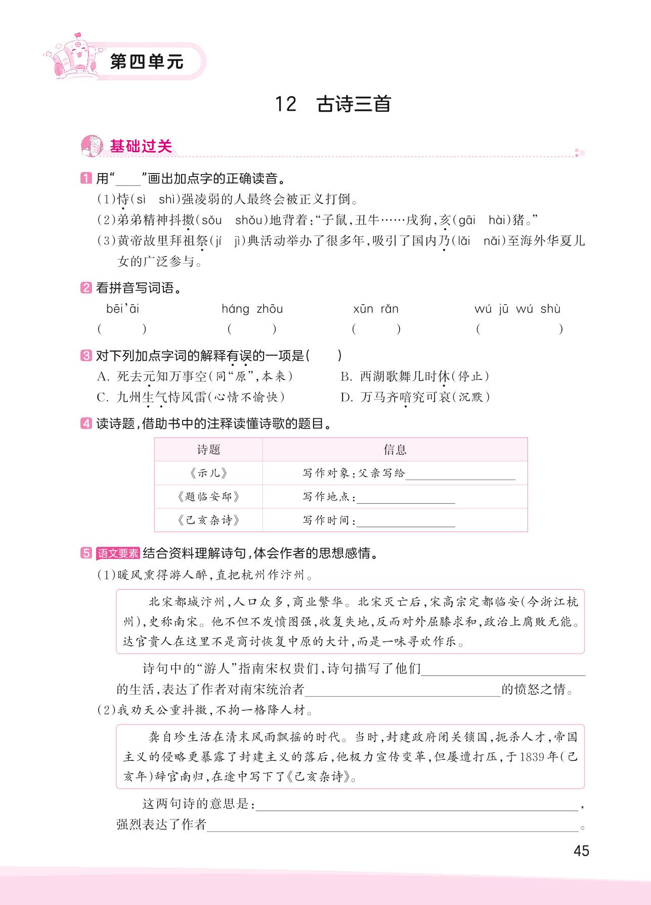 2023上册五年级语文人教版 第四单元 爱国情怀——12 古诗三首