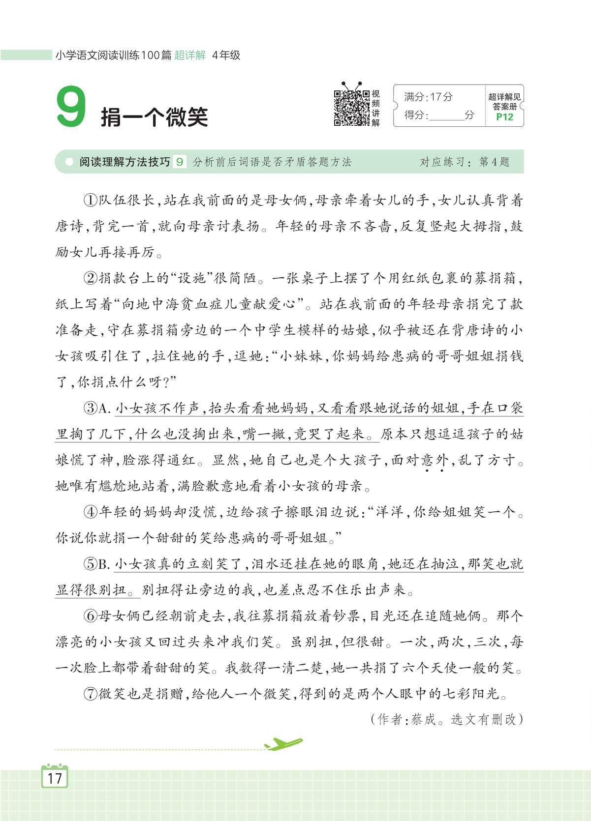 2024全一册四年级语文人教版 专题一 写人 9 捐一个微笑