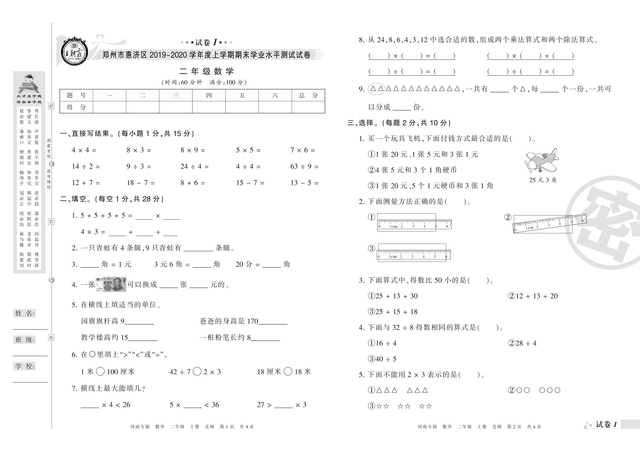 2019-2020学年第一学期郑州市惠济区二年级数学试卷(北师版)【1】