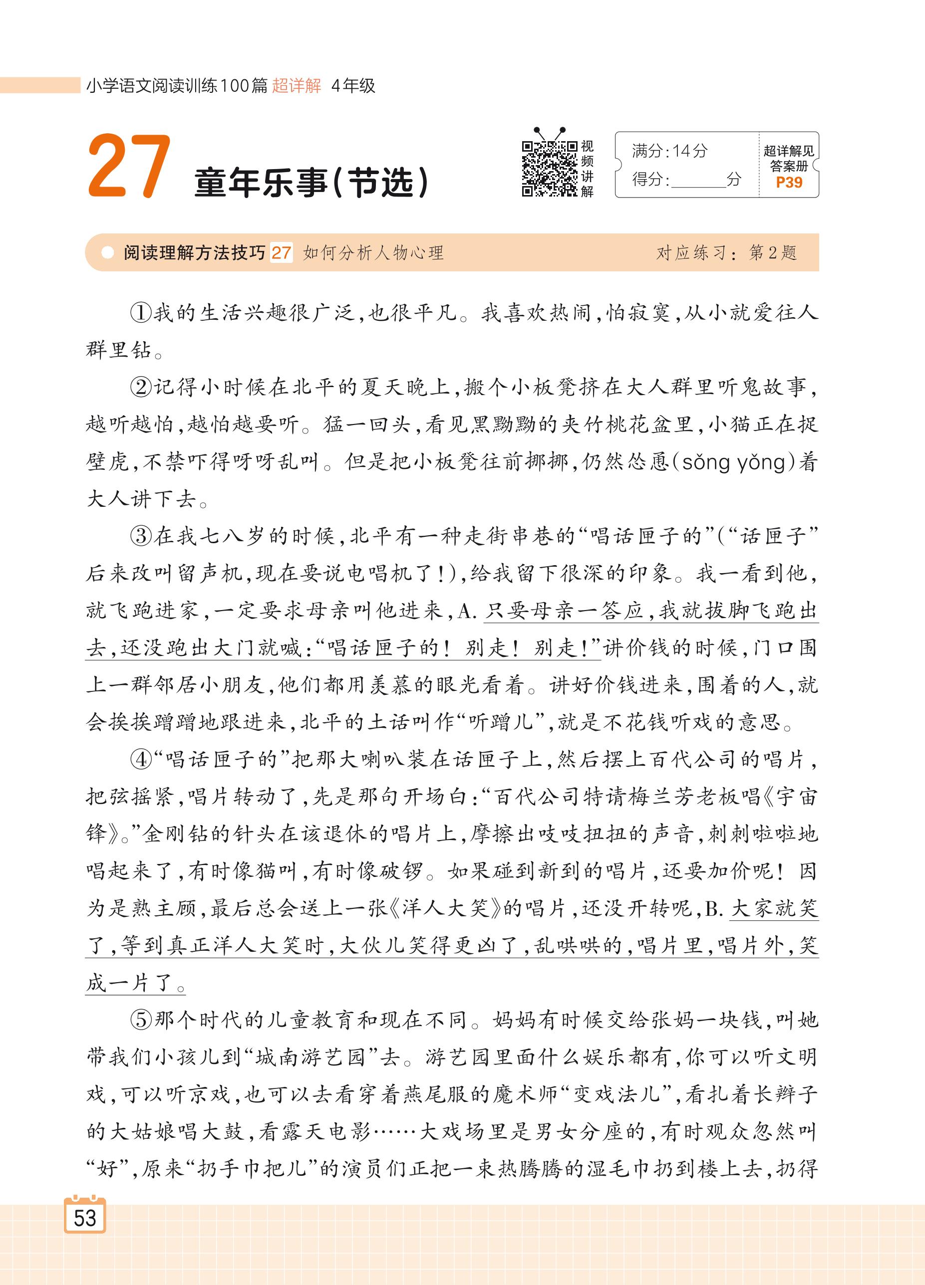 2024全一册四年级语文人教版 专题二 记事 27 童年乐事(节选)