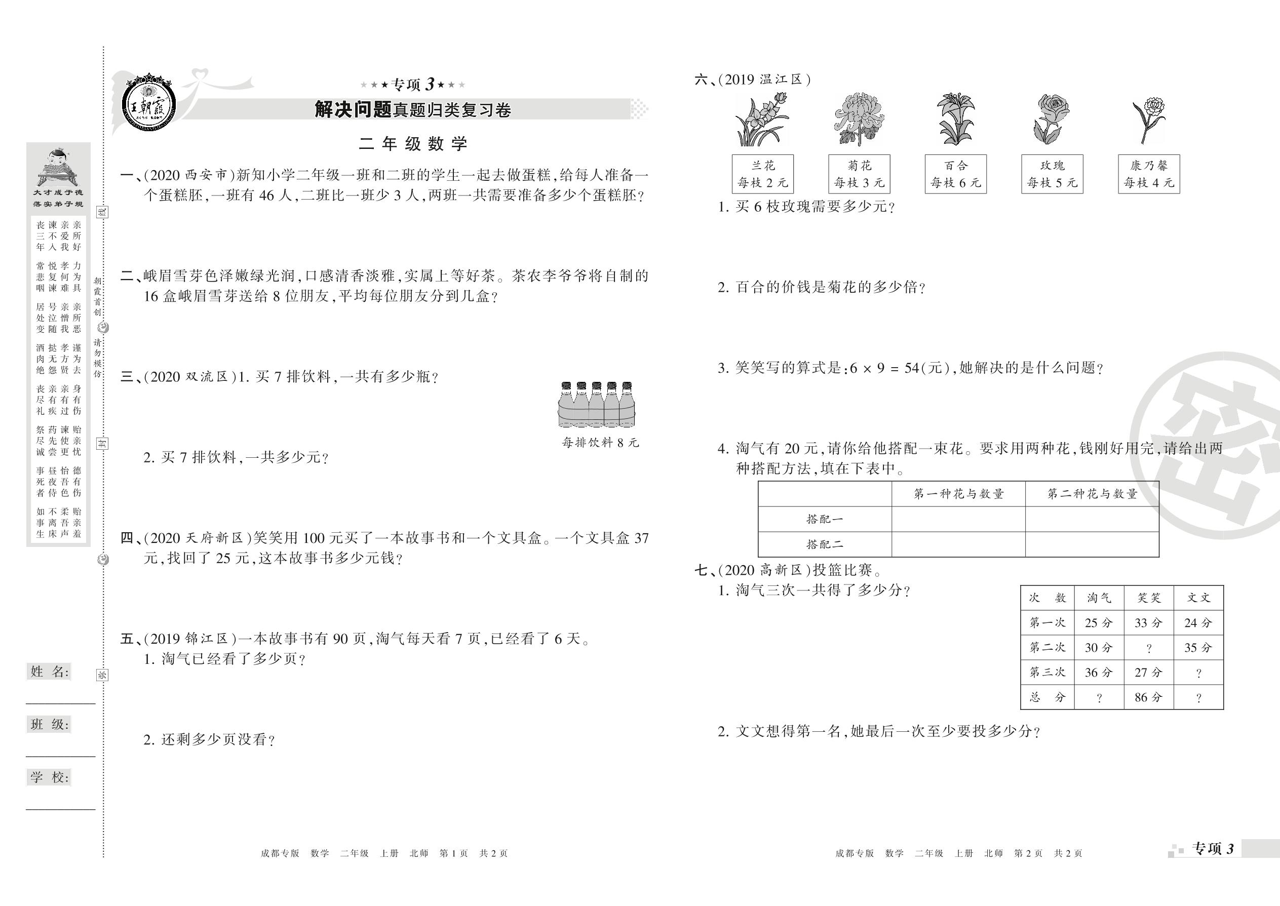 王朝霞期末专项卷——解决问题真题归类复习、新颖题速递:生活与数学二年级上册数学(北师版)_R21080385507【0】