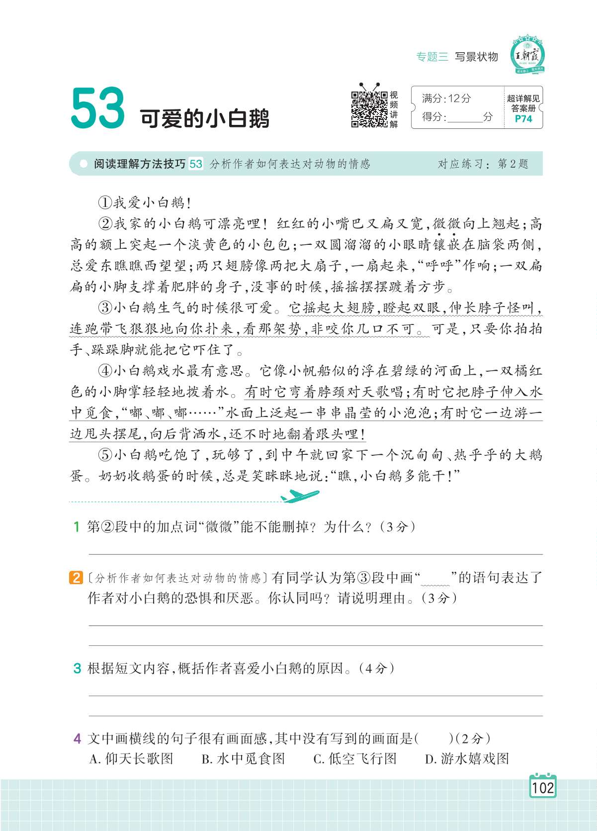 2024全一册四年级语文人教版 专题三 写景状物 53 可爱的小白鹅