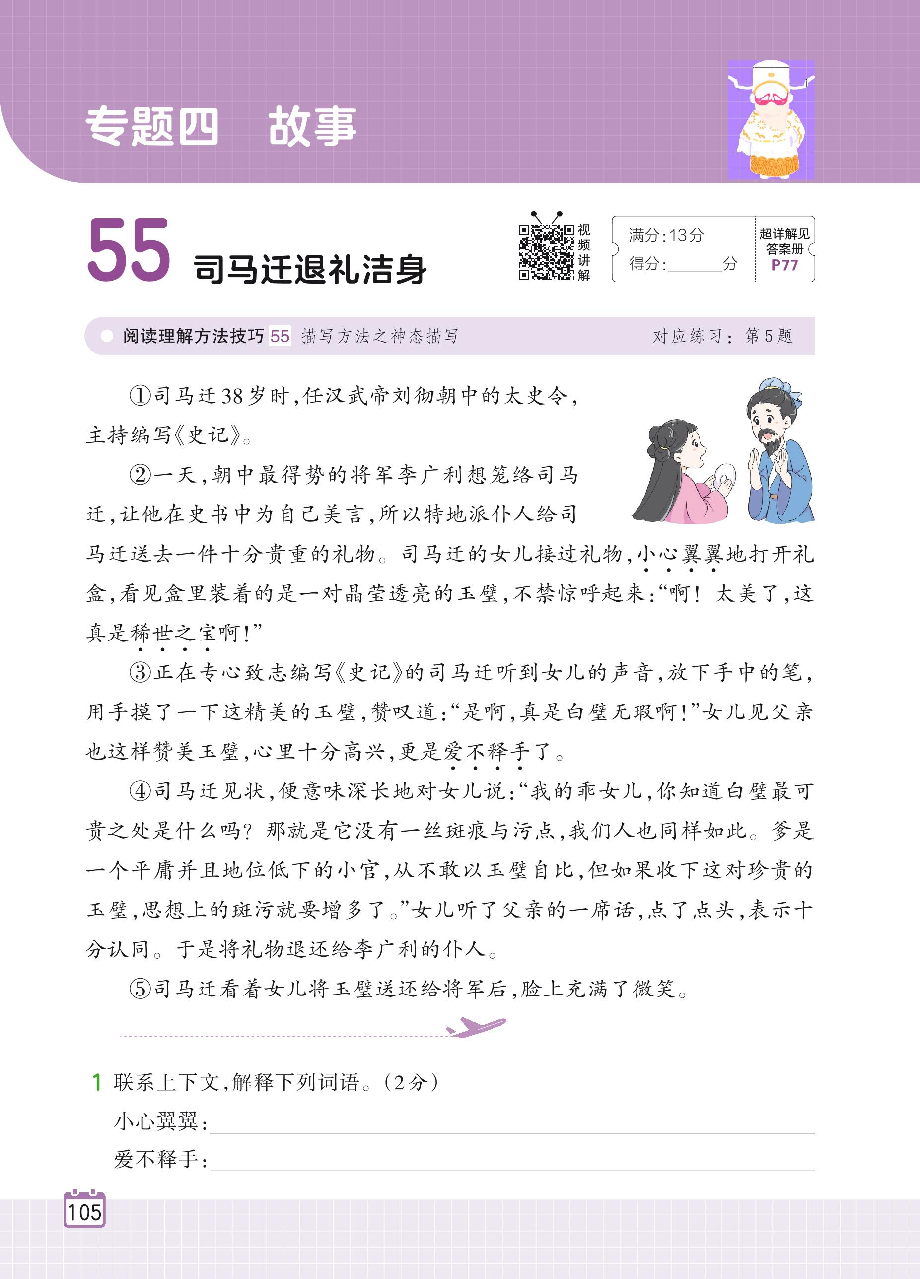 2024全一册四年级语文人教版 专题四 故事 55 司马迁退礼洁身