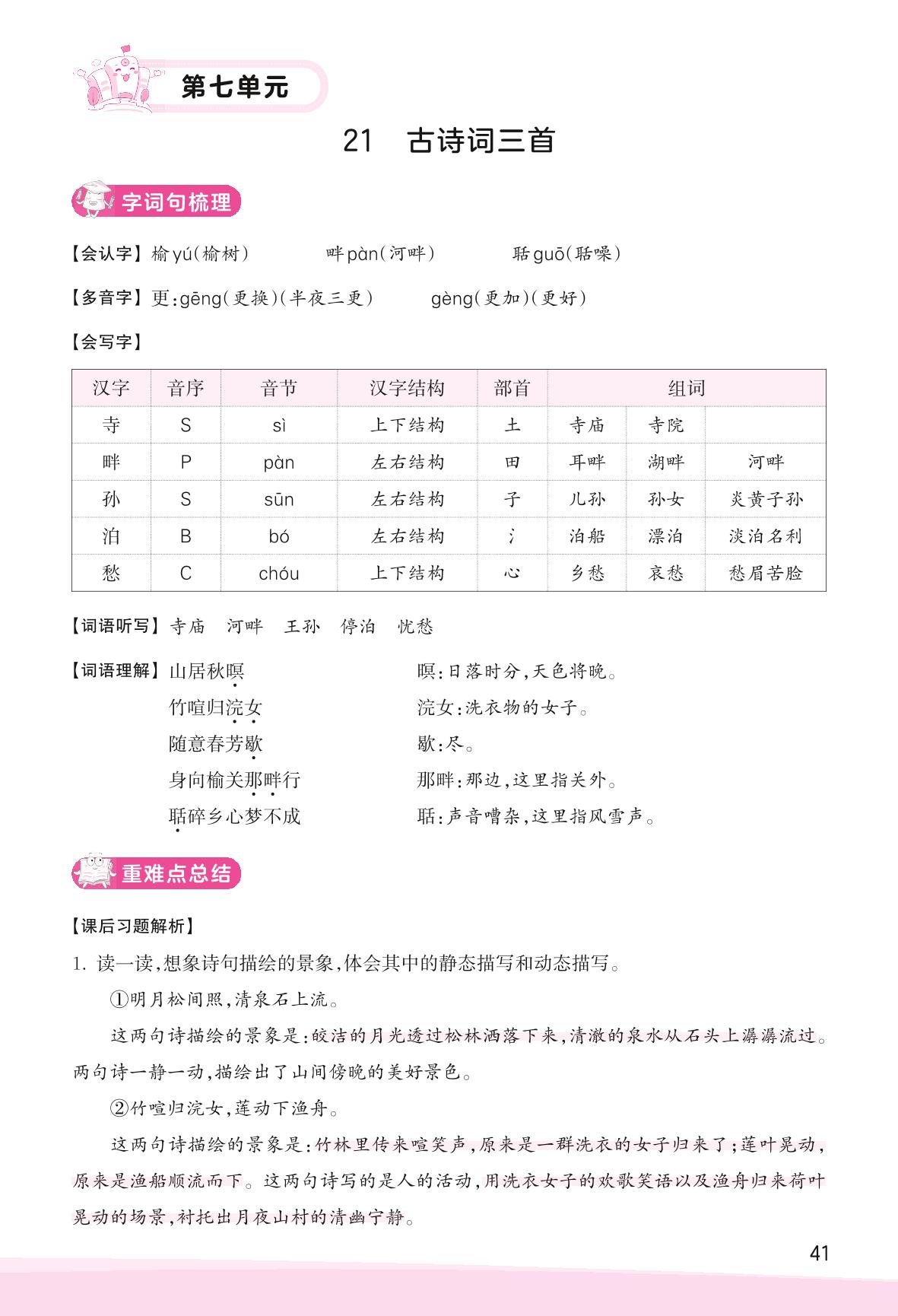 2023上册五年级语文人教版 助学手册 第七单元——21 古诗词三首