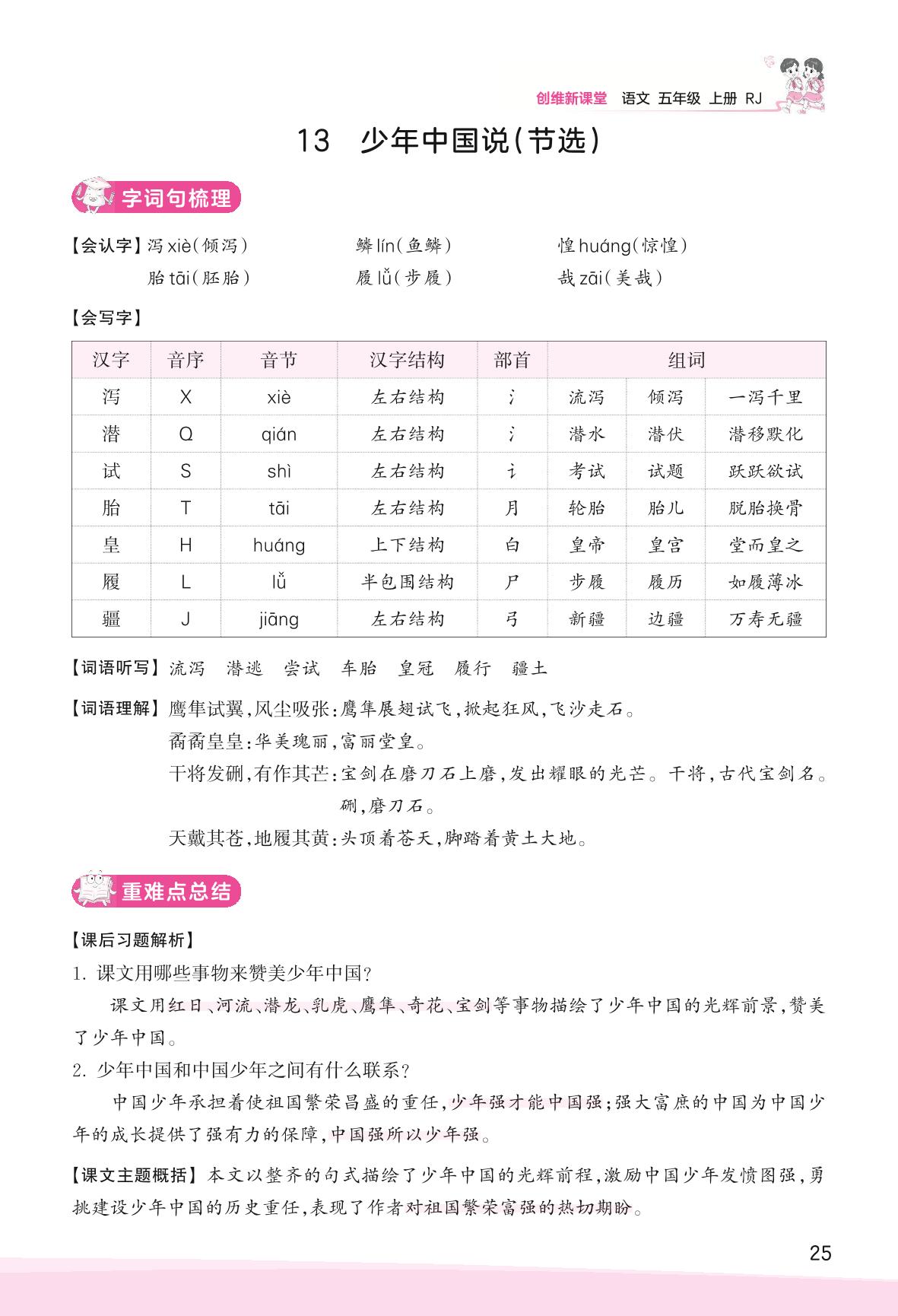 2023上册五年级语文人教版 助学手册 第四单元——13 少年中国说(节选)