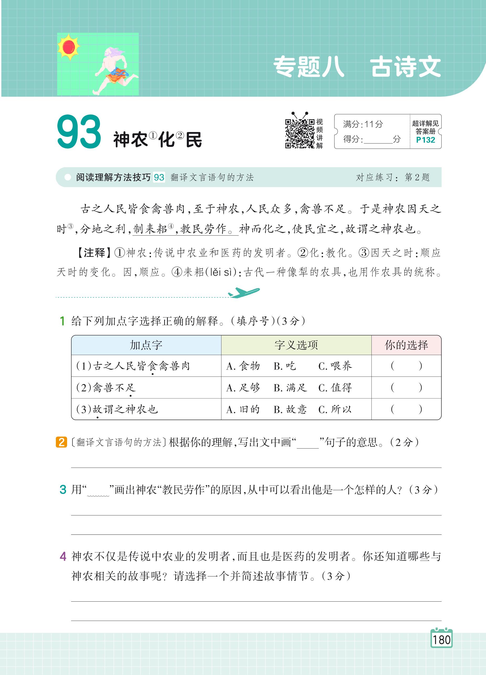 2024全一册四年级语文人教版 专题八 古诗文 93 神农化民