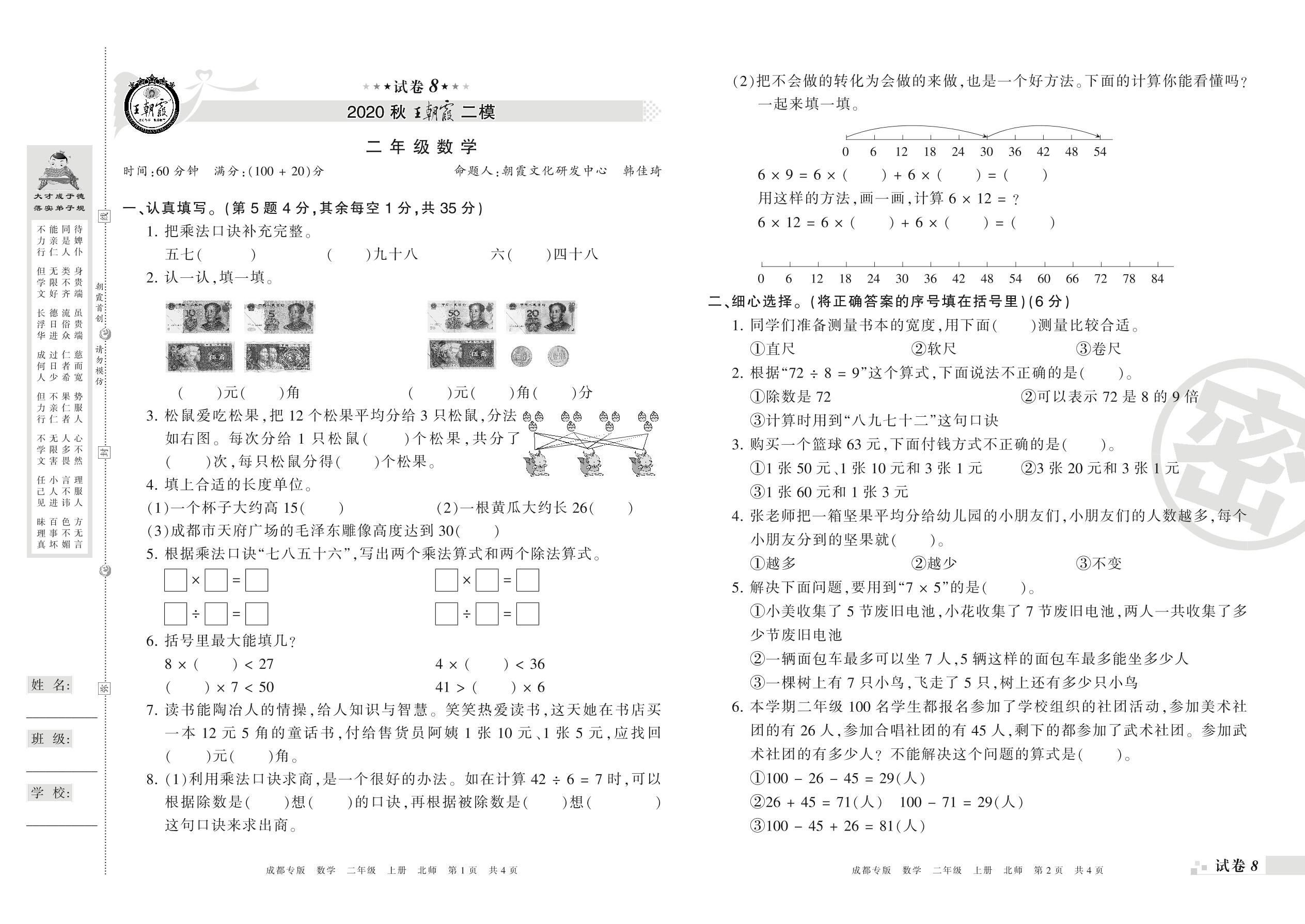 王朝霞期末模拟卷二年级上册数学(北师版)_R21080385538【8】