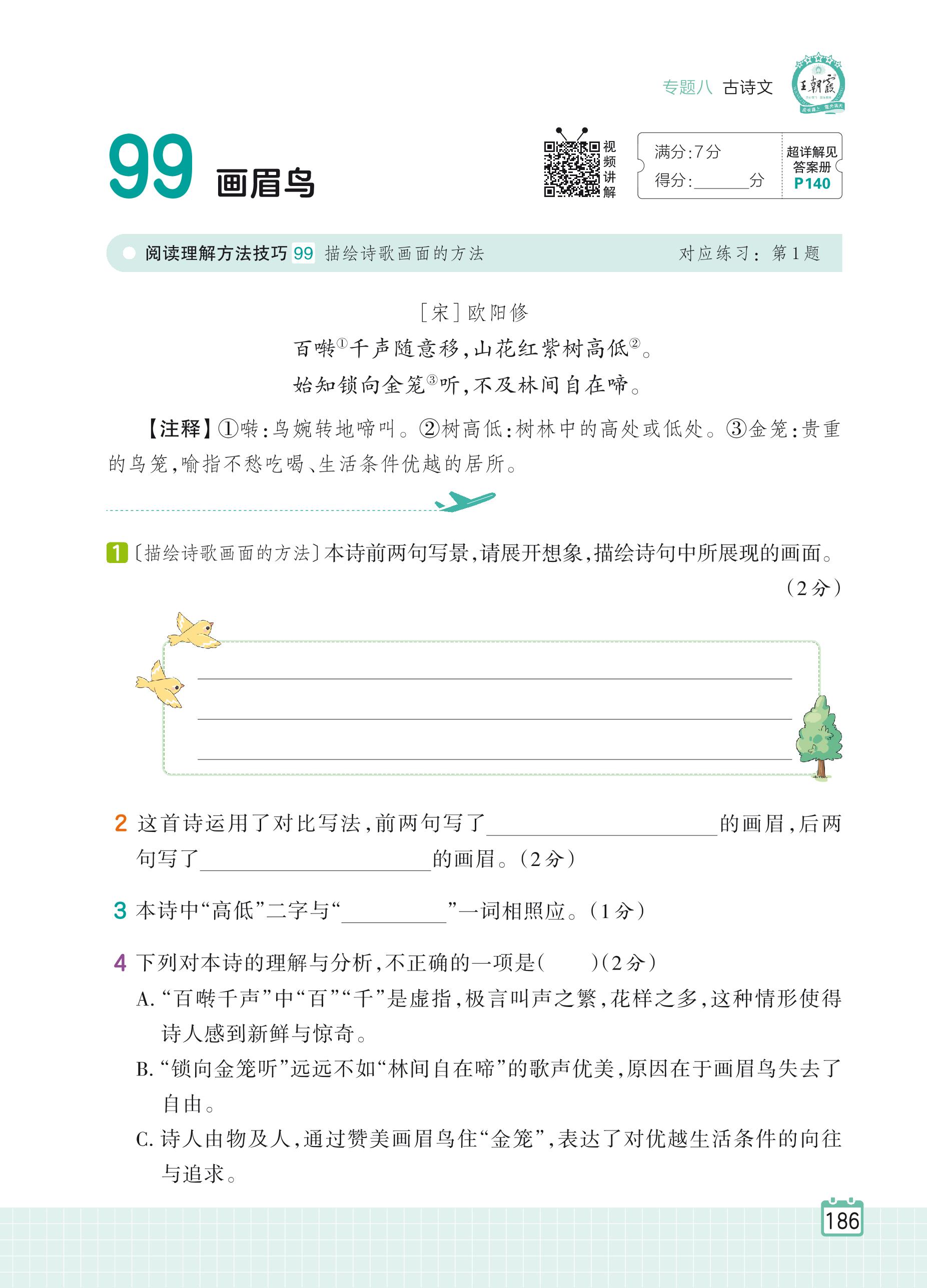 2024全一册四年级语文人教版 专题八 古诗文 99 画眉鸟