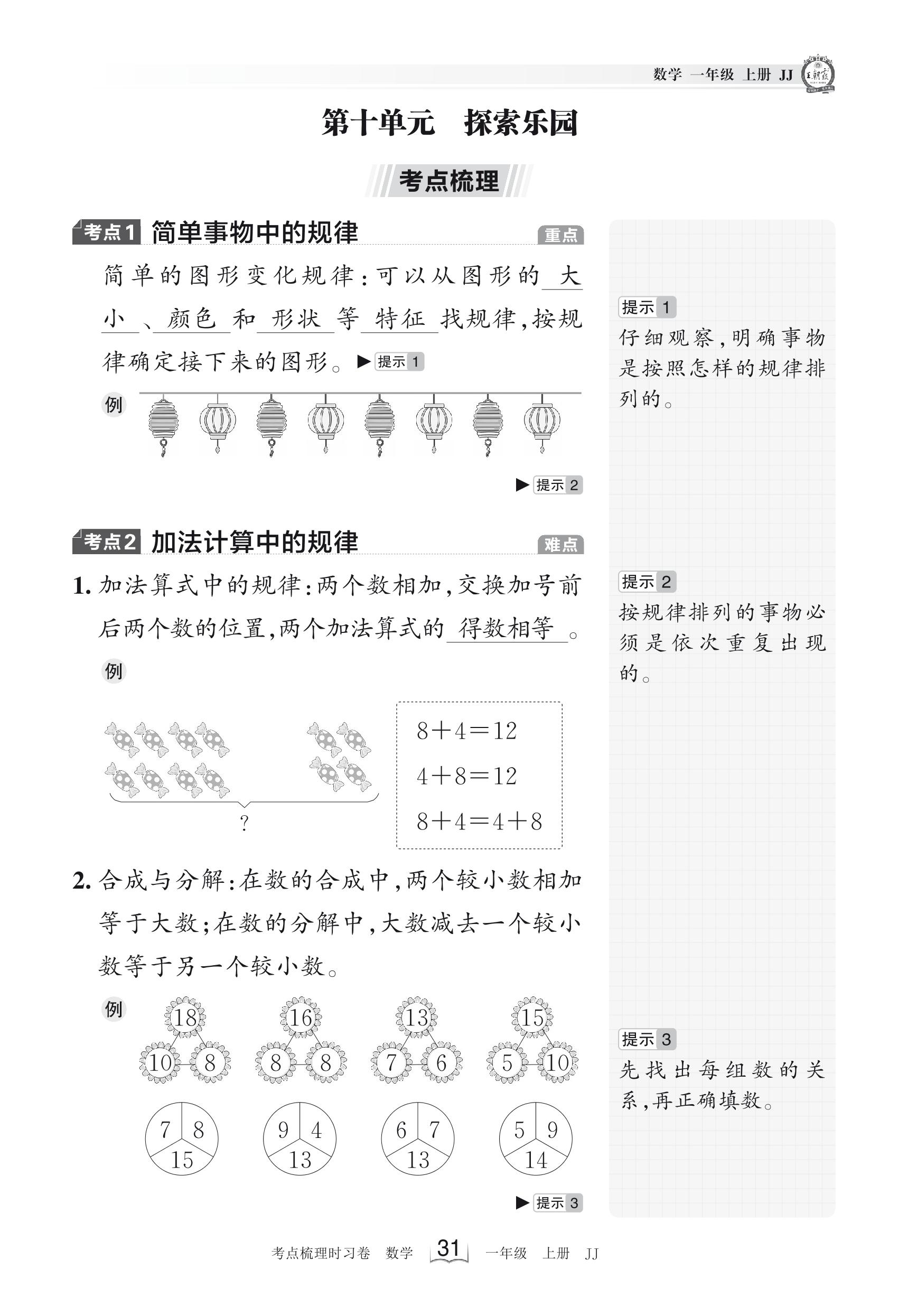 2023上册一年级数学冀教版 考点梳理手册——第十单元 探索乐园
