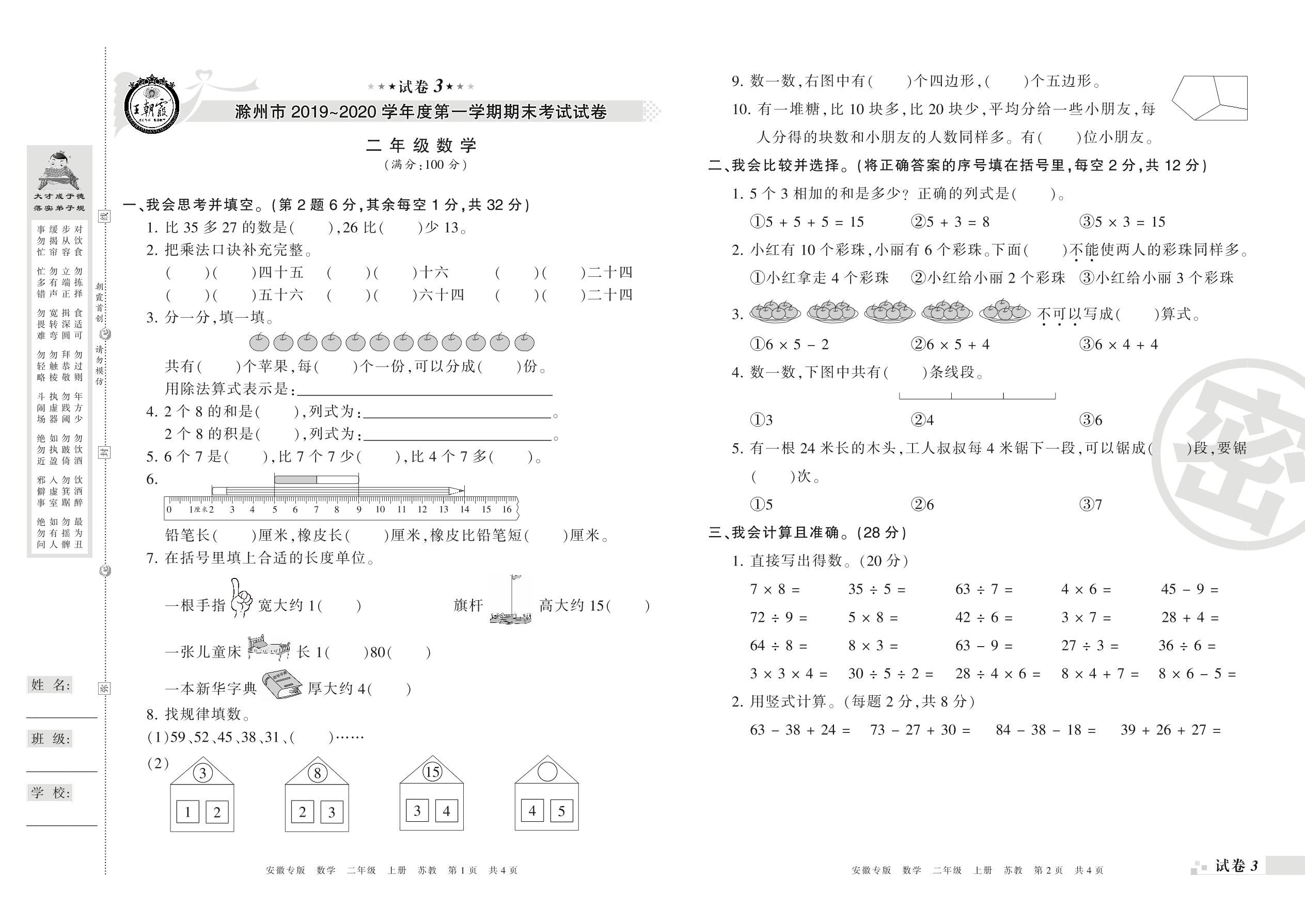 2019-2020学年第一学期滁州市二年级数学试卷(苏教版)【3】