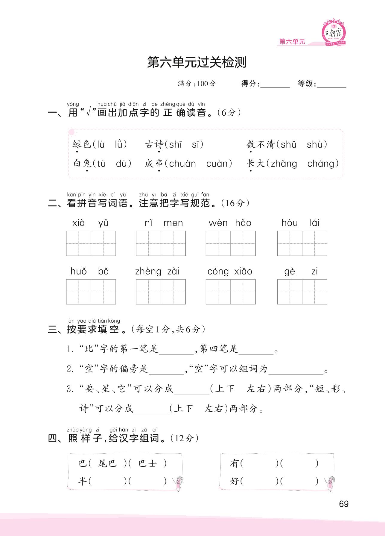 2023上册一年级语文人教版 第六单元过关检测