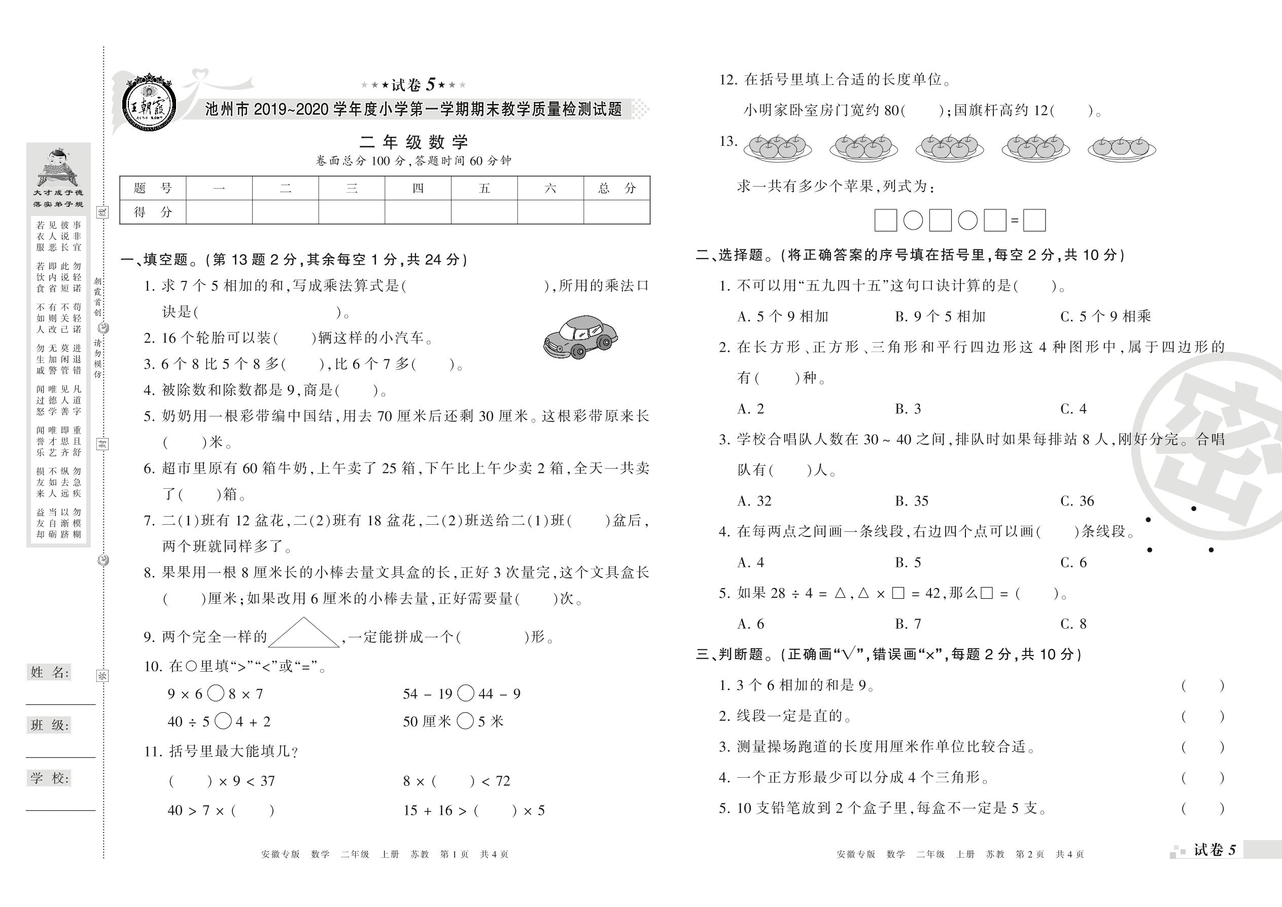 2019-2020学年第一学期池州市二年级数学试卷(苏教版)【5】