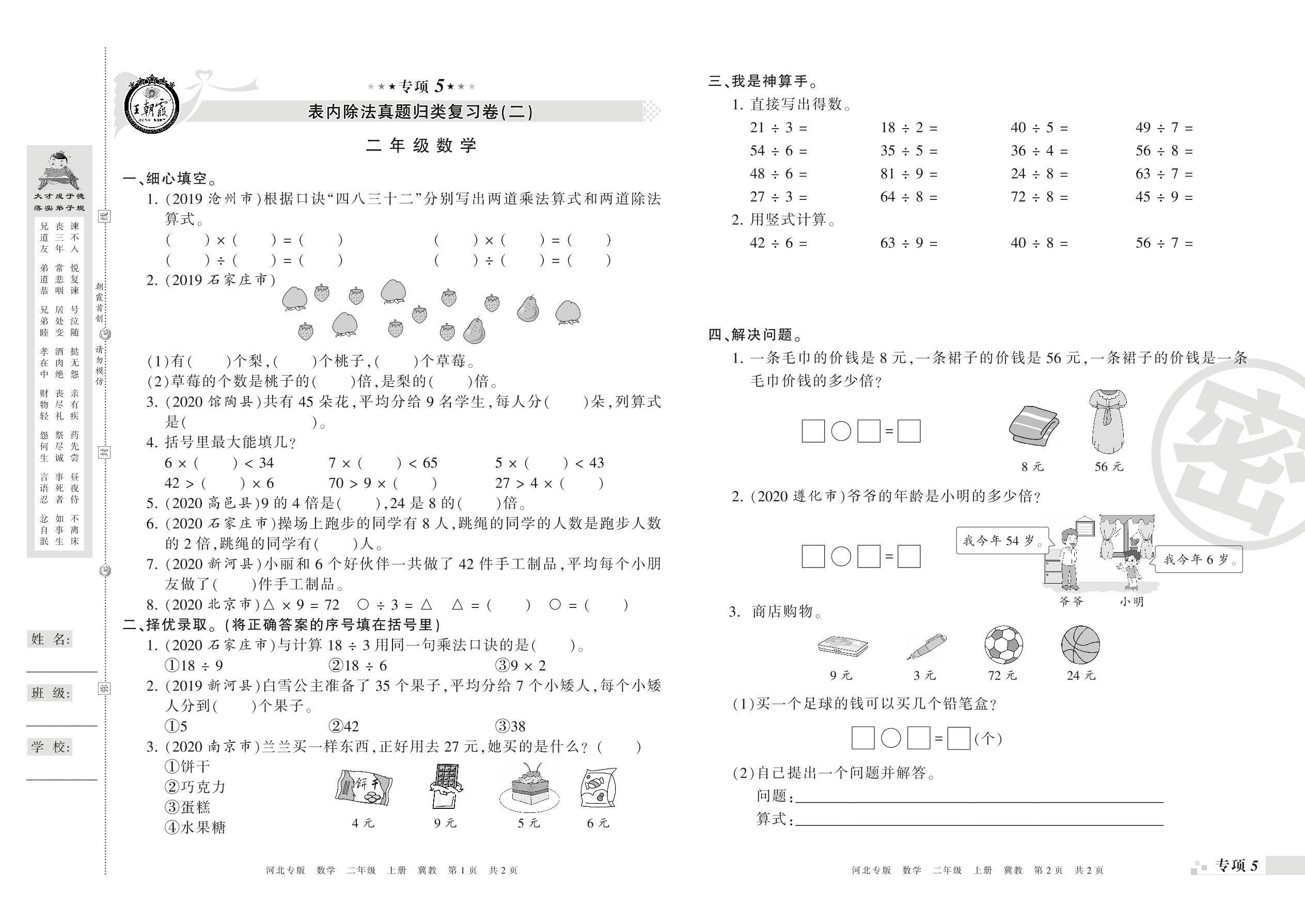 王朝霞期末专项卷——表内除法、观察物体及角的认识二年级上册数学(冀教版)【0】