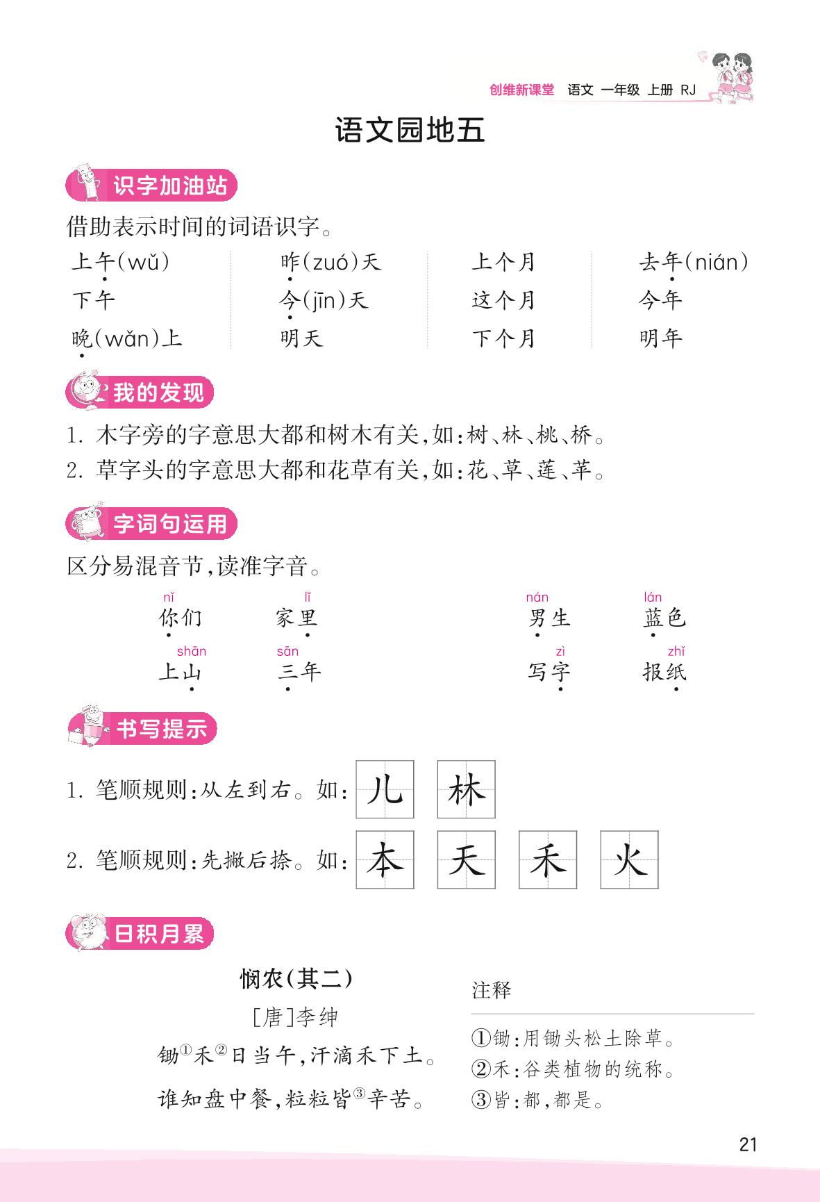 2023上册一年级语文人教版 助学手册 第五单元——语文园地五