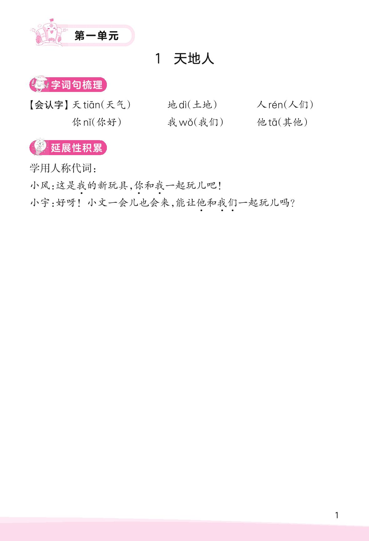 2023上册一年级语文人教版 助学手册 第一单元——1 天地人