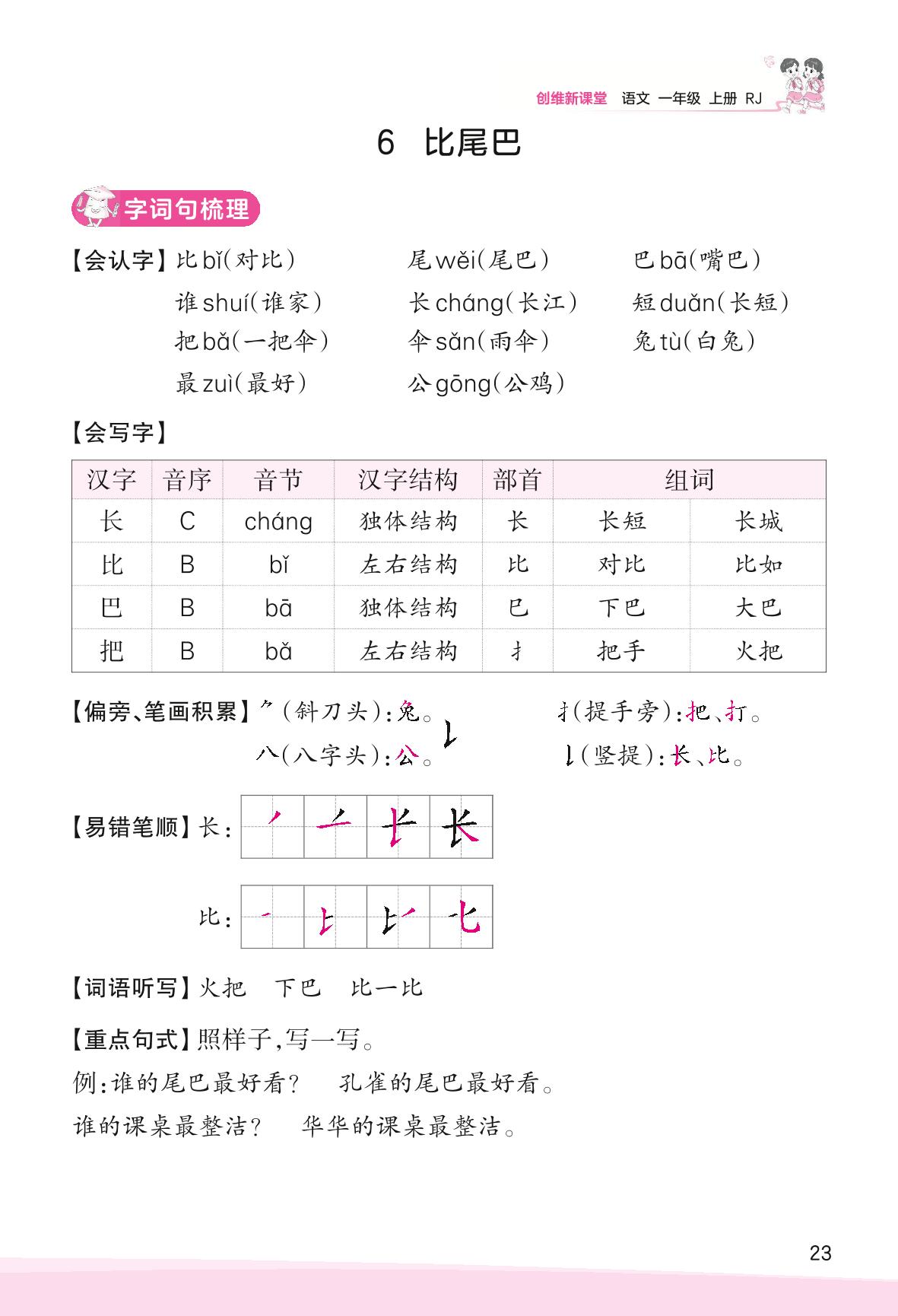2023上册一年级语文人教版 助学手册 第六单元——6 比尾巴