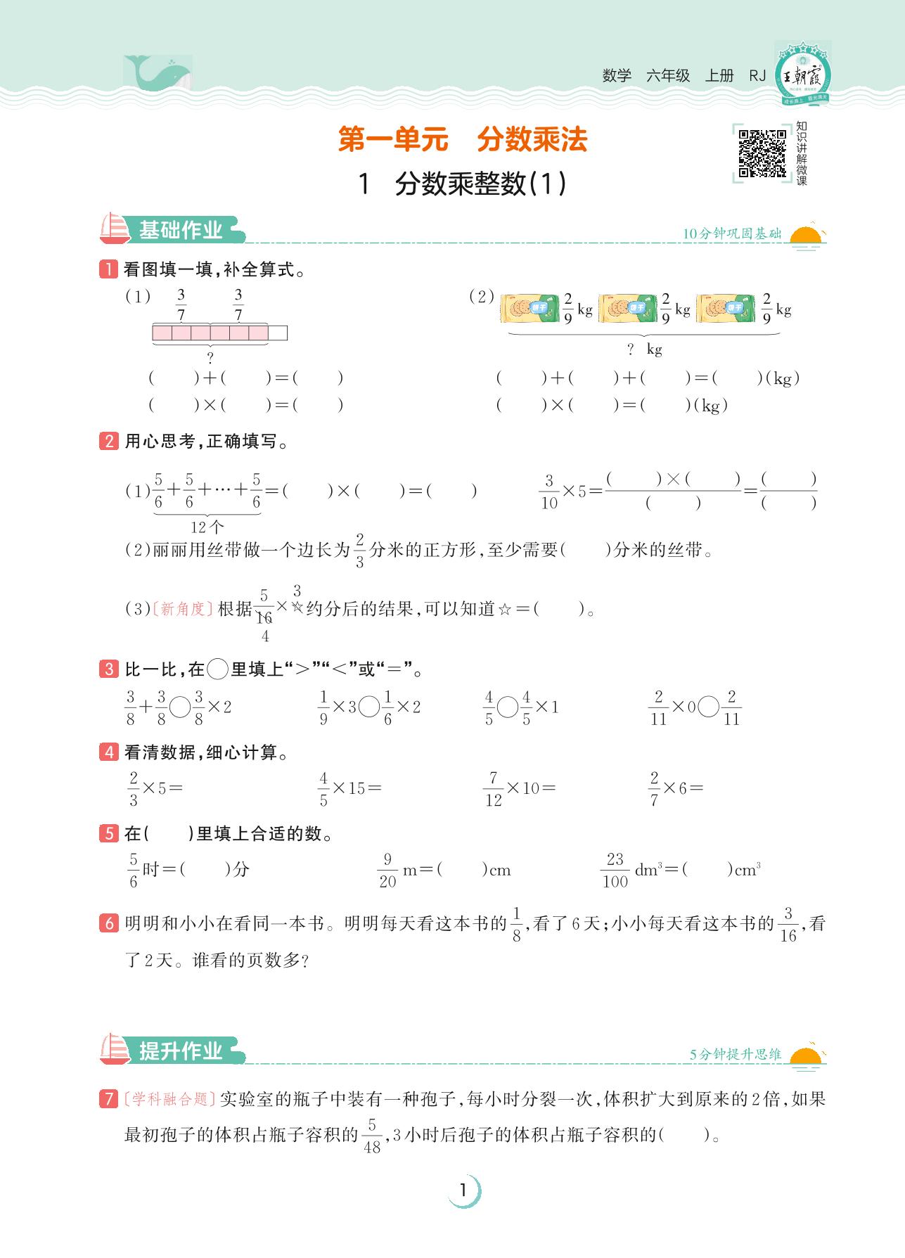 2023上册六年级数学人教版 第一单元 分数乘法——1 分数乘整数(1)