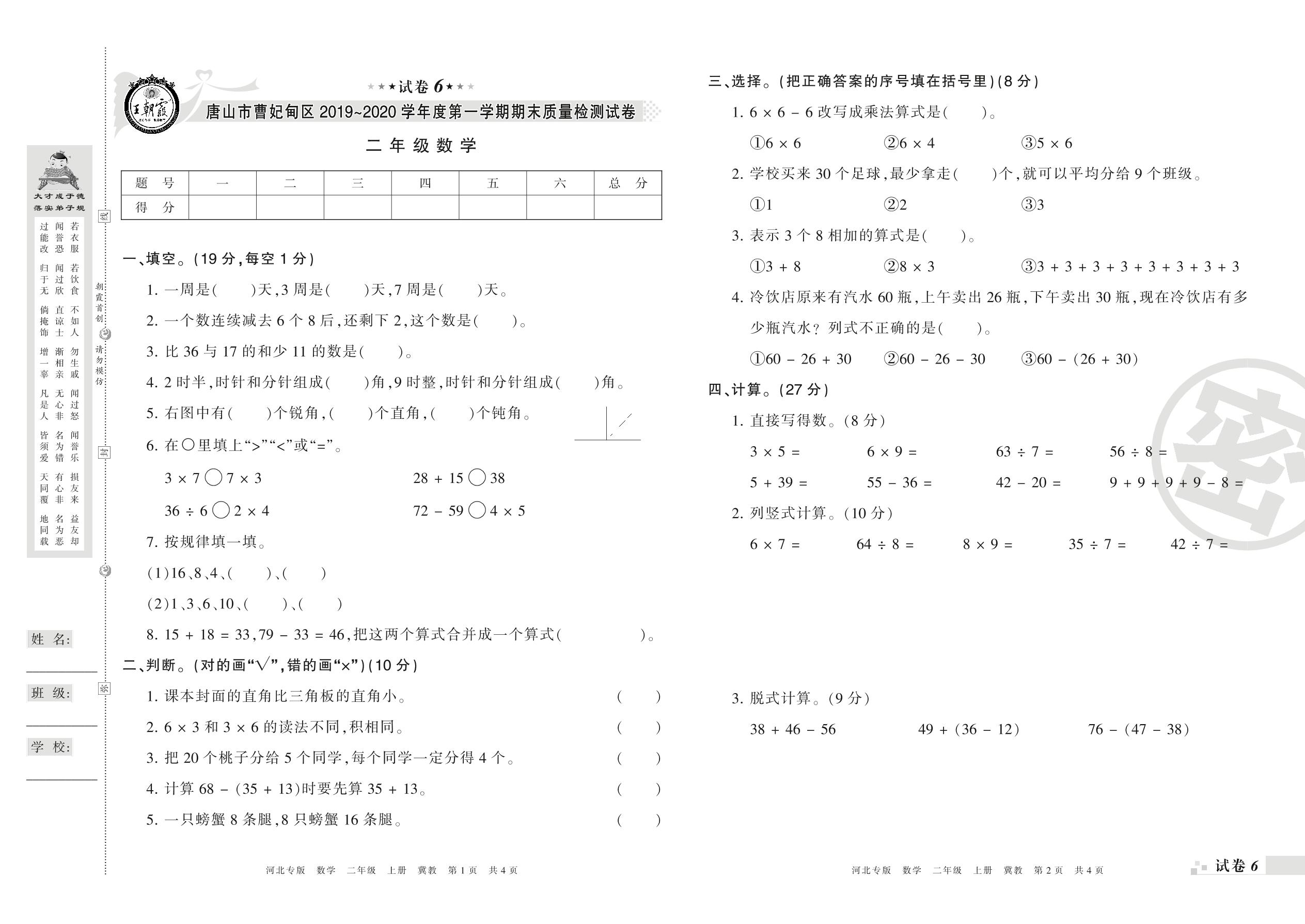 2019-2020学年第一学期唐山市曹妃甸区二年级数学试卷(冀教版)【6】