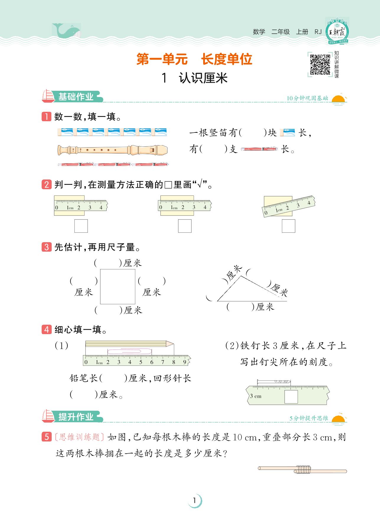 2023上册二年级数学人教版 第一单元 长度单位——1 认识厘米