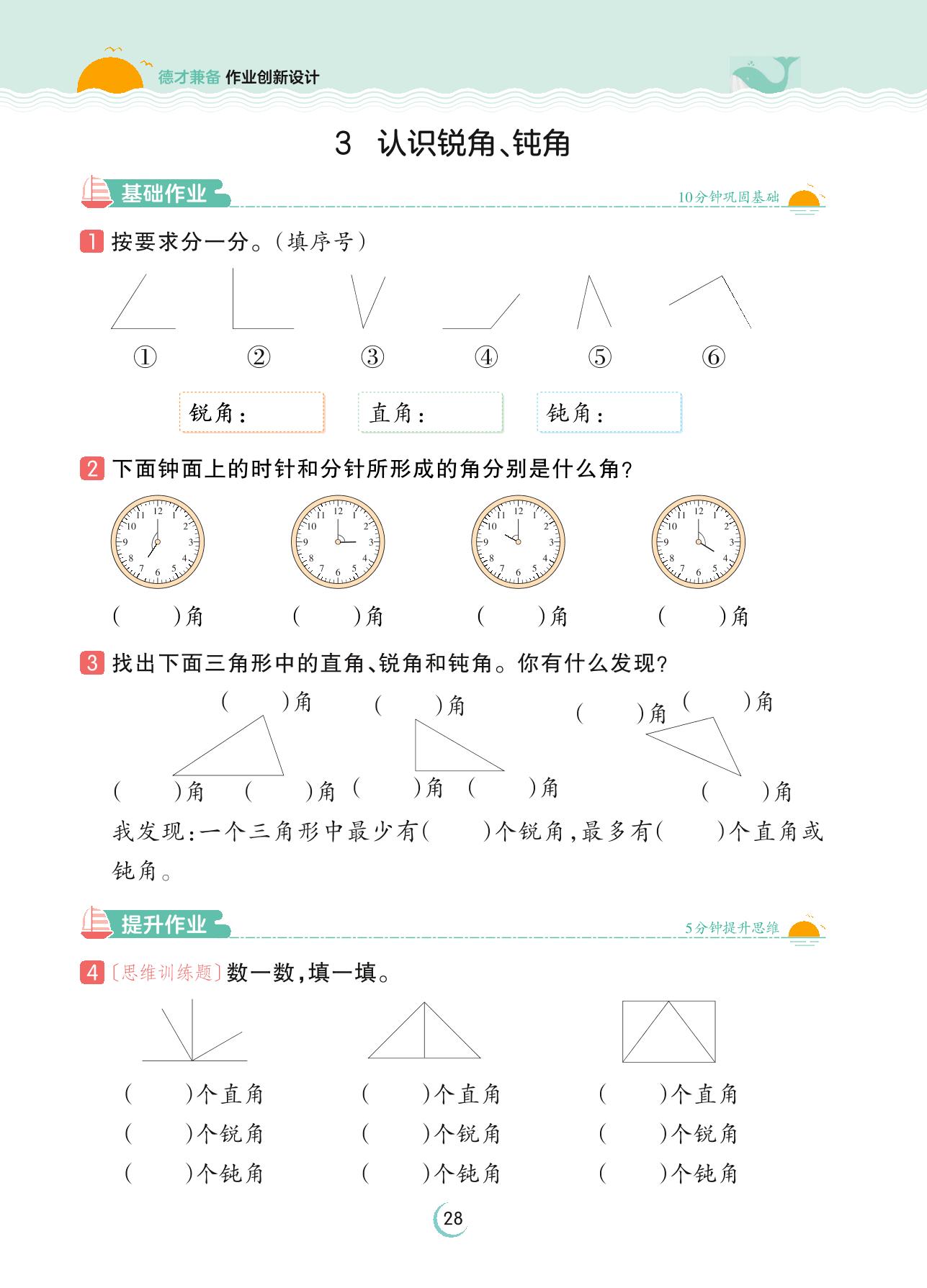 2023上册二年级数学人教版 第三单元 角的初步认识——3 认识锐角、钝角