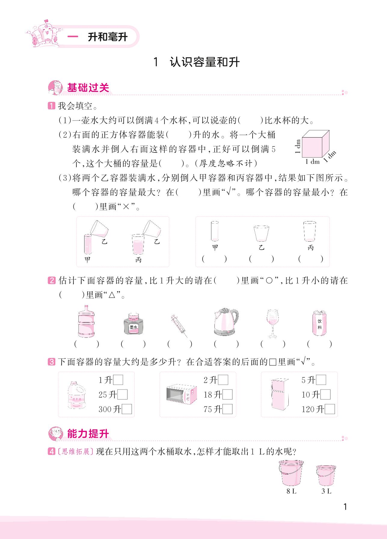 2023上册四年级数学苏教版 一 升和毫升——1 认识容量和升