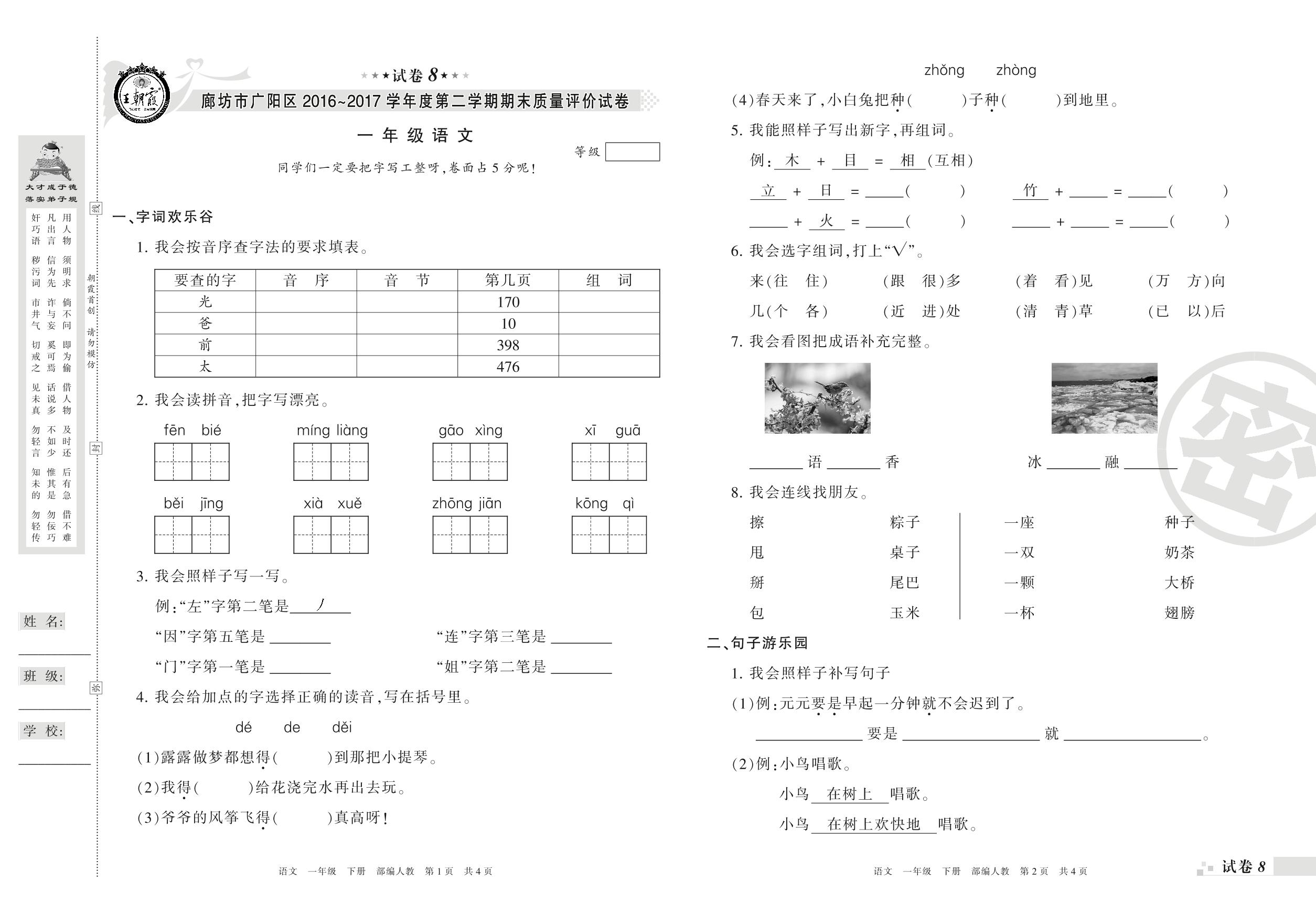 2016-2017学年第二学期廊坊市广阳区一年级语文试卷(人教版)【8】
