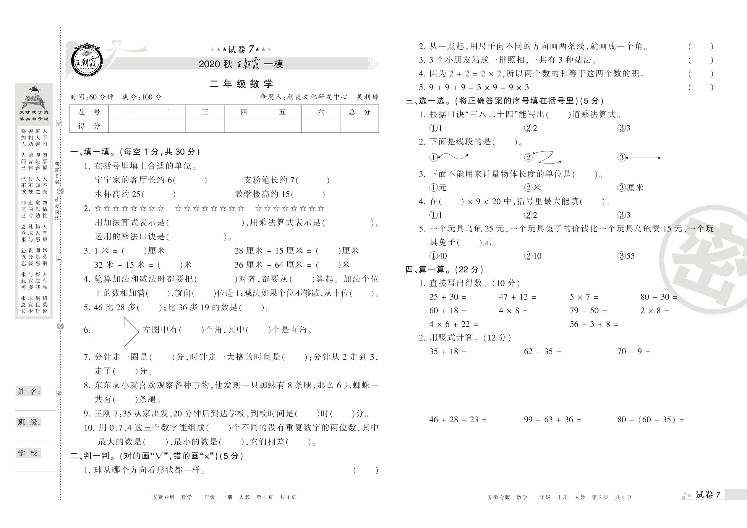 王朝霞期末模拟卷二年级上册数学(人教版)_R21080385814【7】