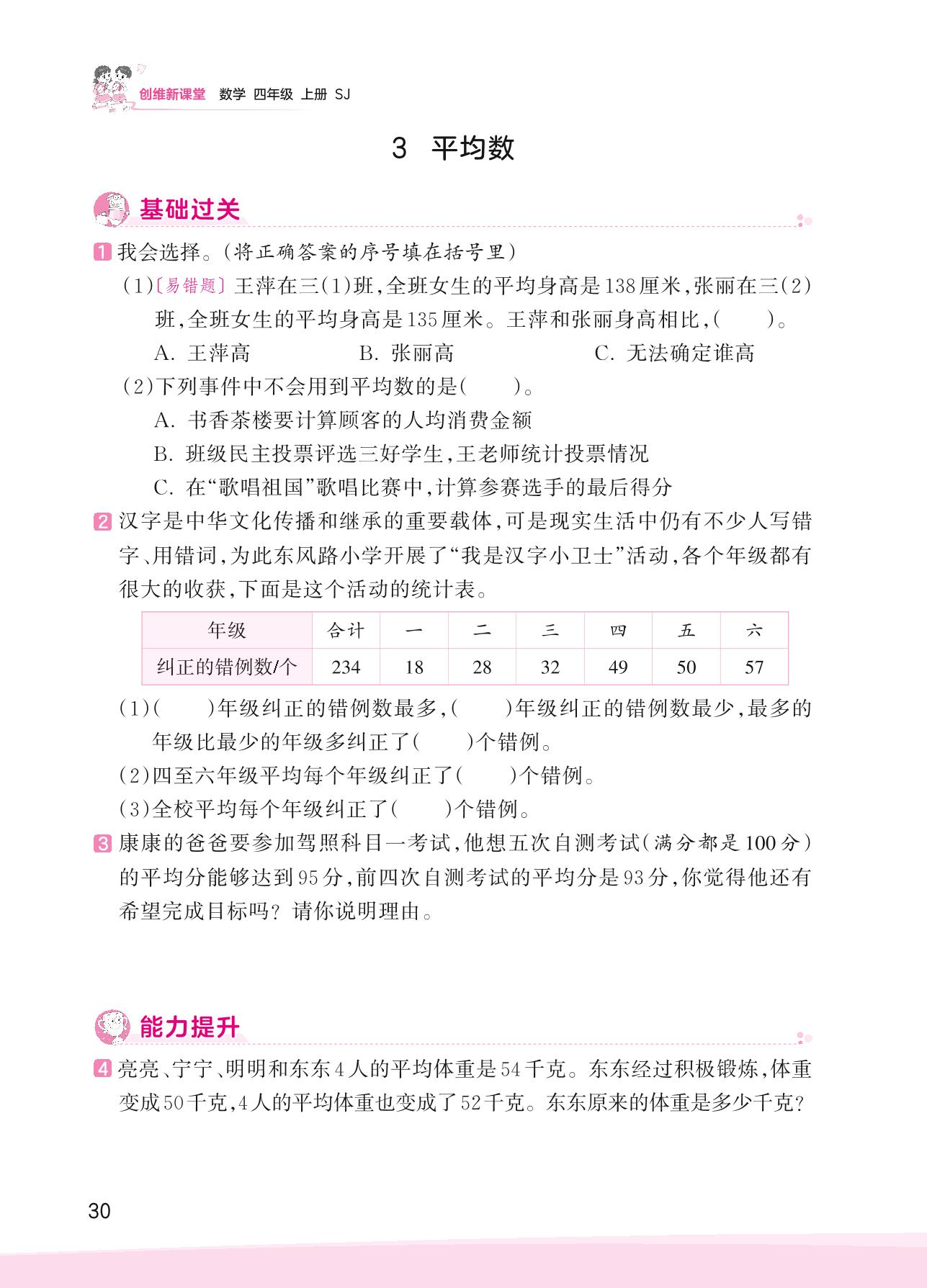 2023上册四年级数学苏教版 四 统计表和条形统计图(一)——3 平均数