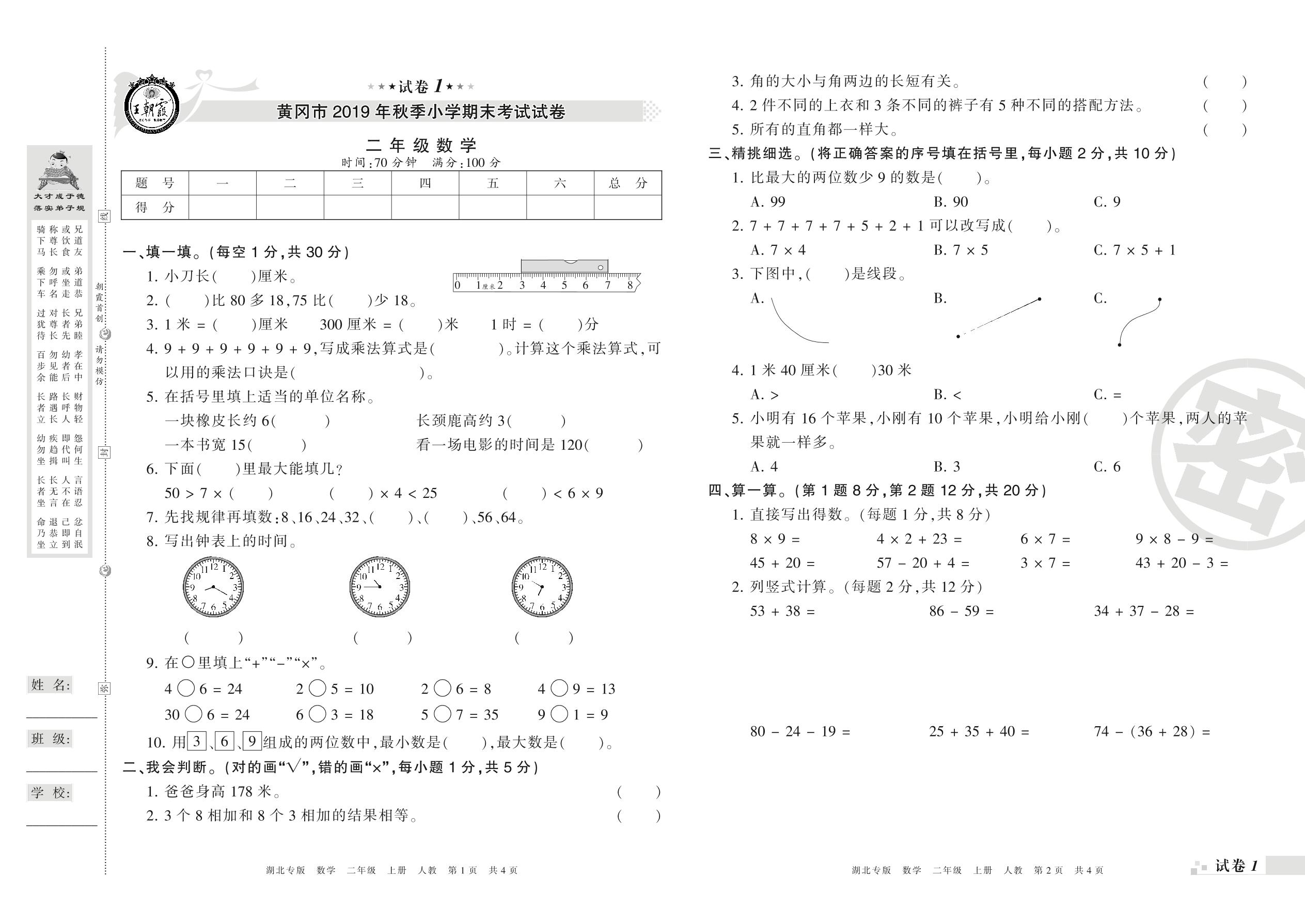 2019-2020学年第一学期黄冈市二年级数学试卷(人教版)【1】