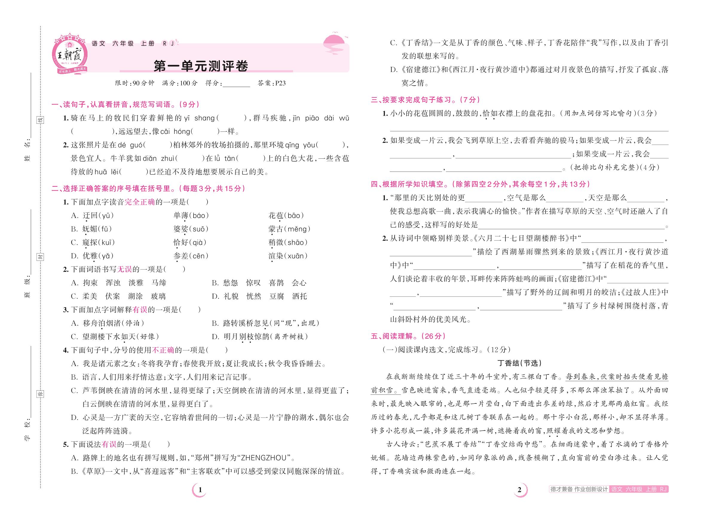 2023上册六年级语文人教版 第一单元测评卷