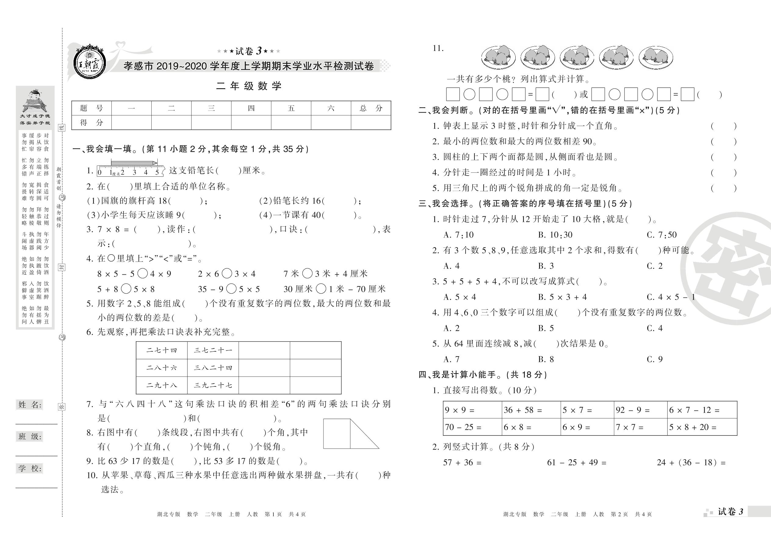 2019-2020学年第一学期孝感市二年级数学试卷(人教版)【3】