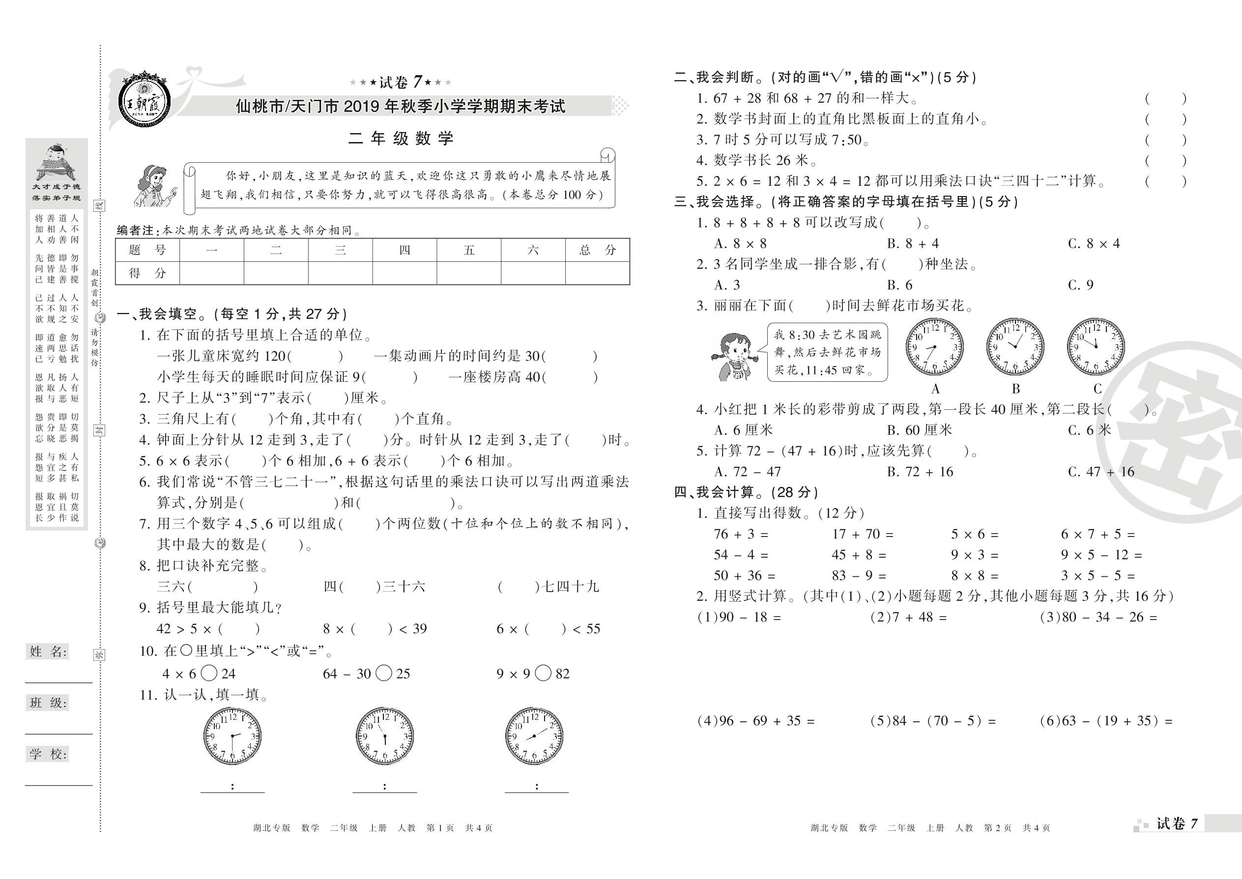 2019-2020学年第一学期仙桃市、天门市二年级数学试卷(人教版)【7】