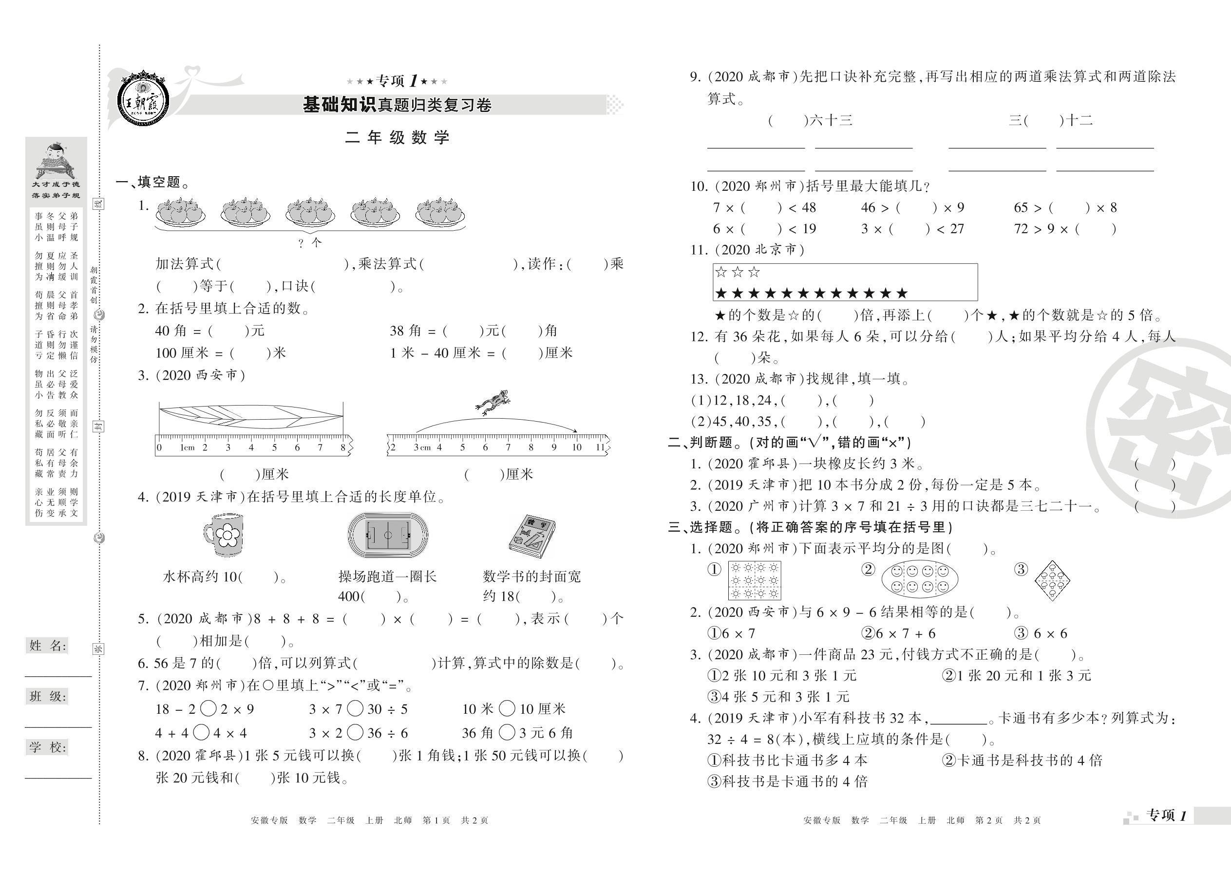 王朝霞期末专项卷——基础知识、计算真题归类复习二年级上册数学(北师版)