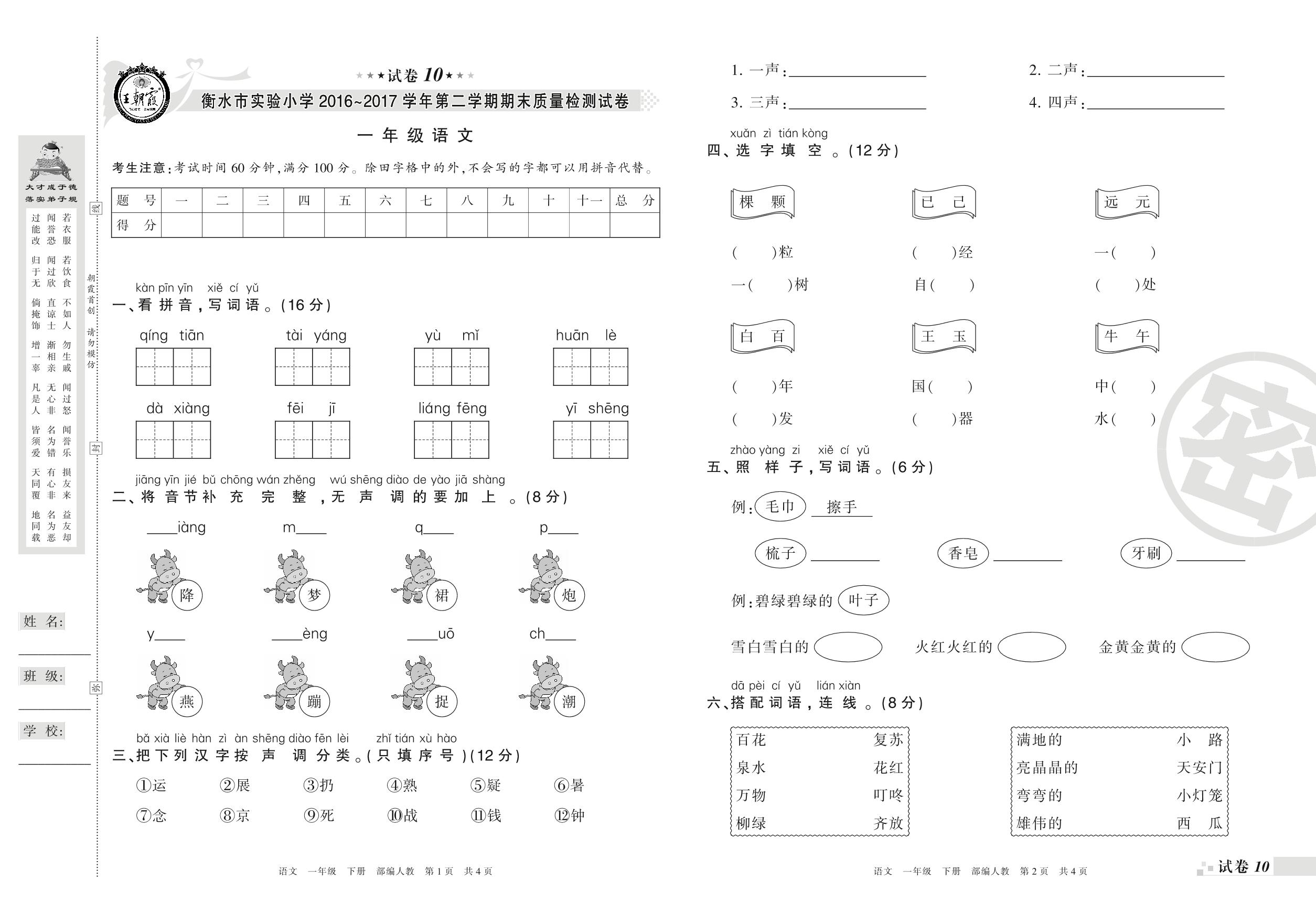 一年级语文人教版下册期末卷