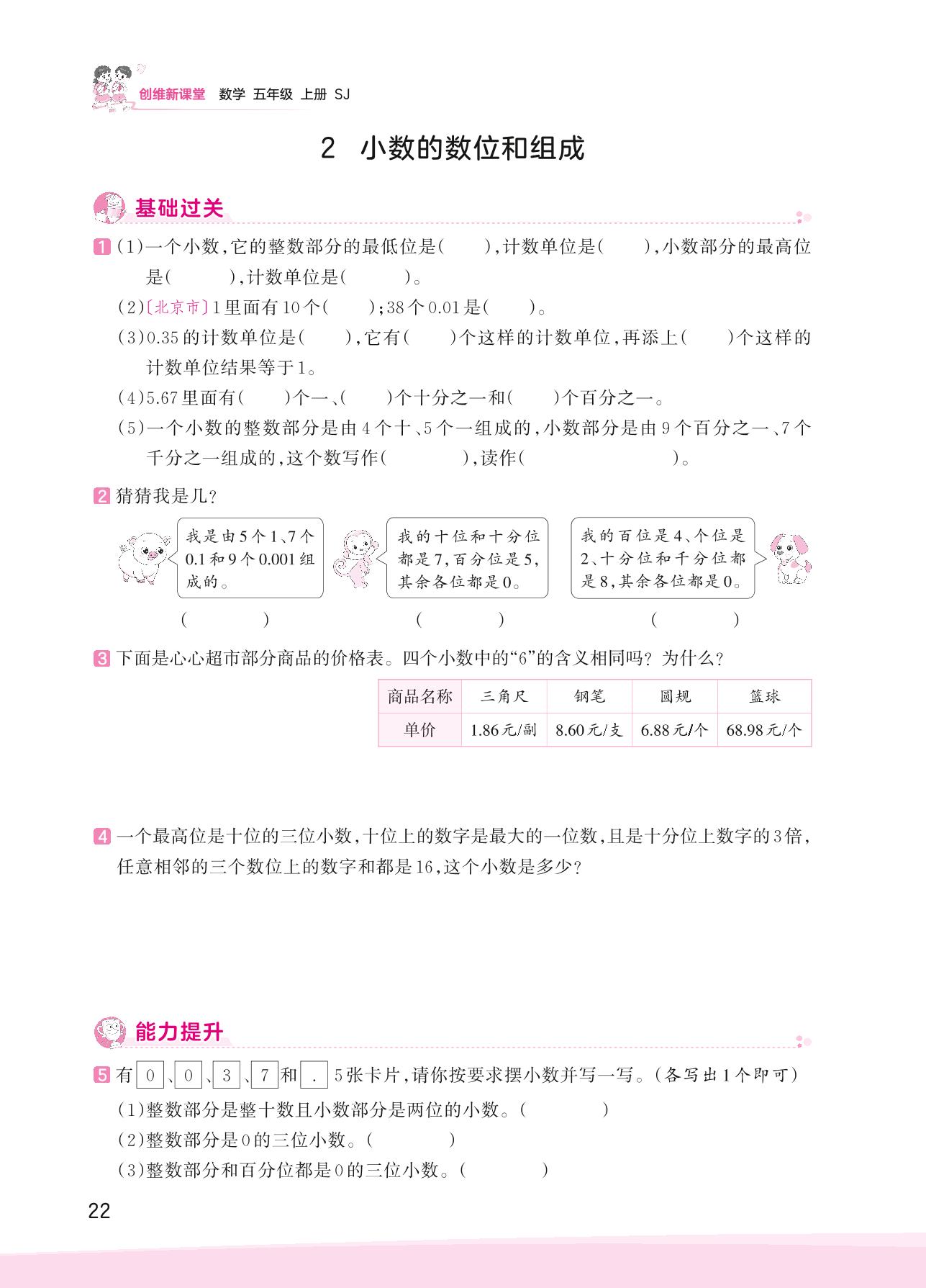 2023上册五年级数学苏教版 三 小数的意义和性质——2 小数的数位和组成
