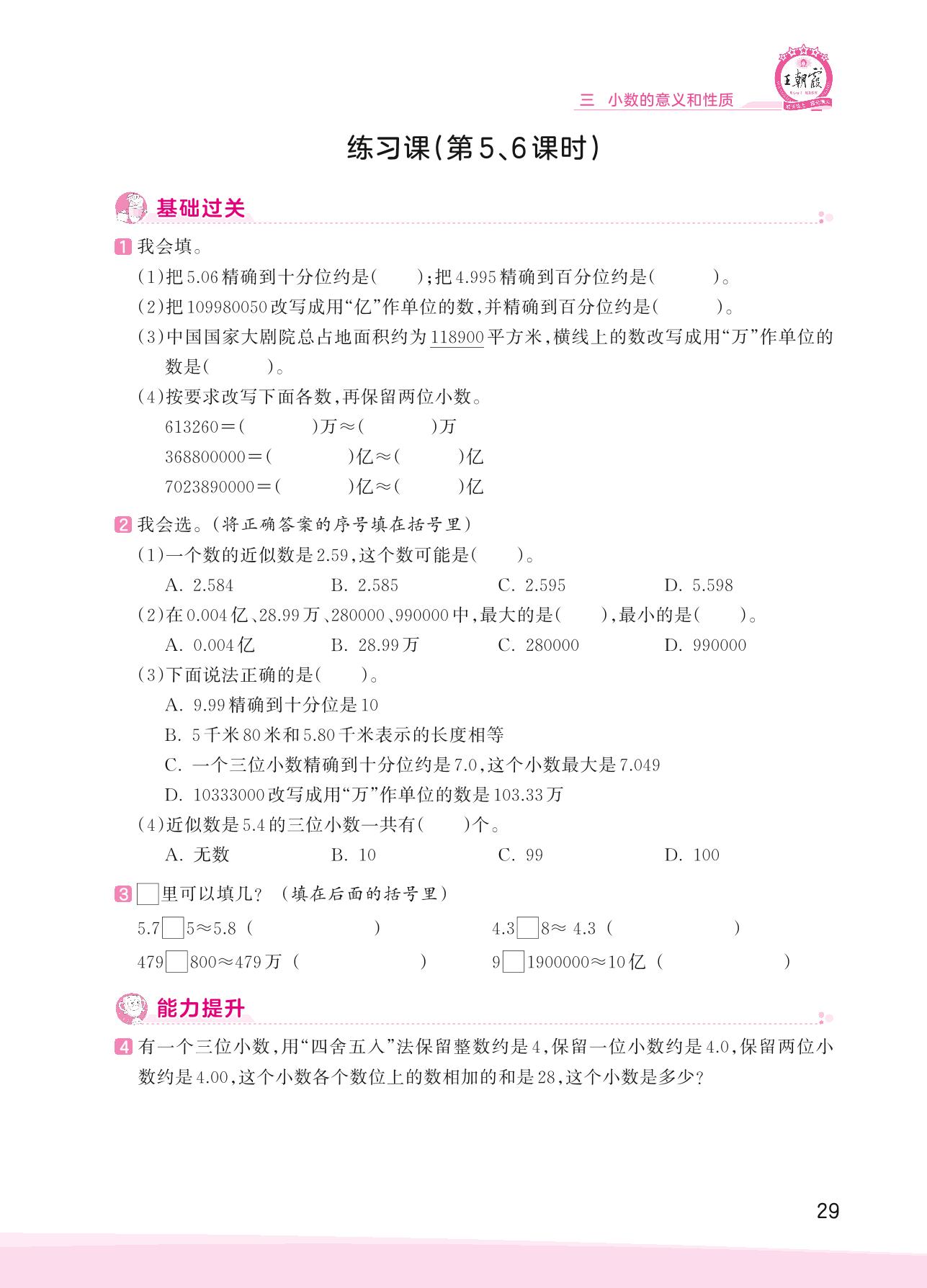 2023上册五年级数学苏教版 三 小数的意义和性质——练习课(第5、6课时)
