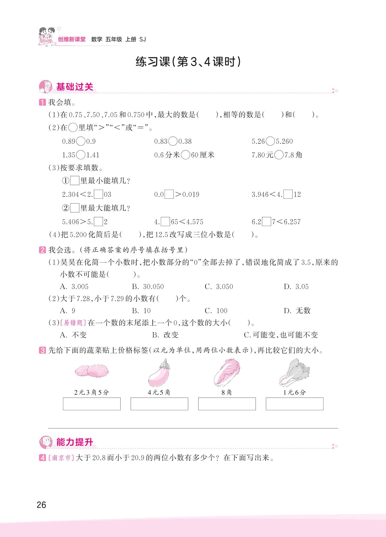 2023上册五年级数学苏教版 三 小数的意义和性质——练习课(第3、4课时)